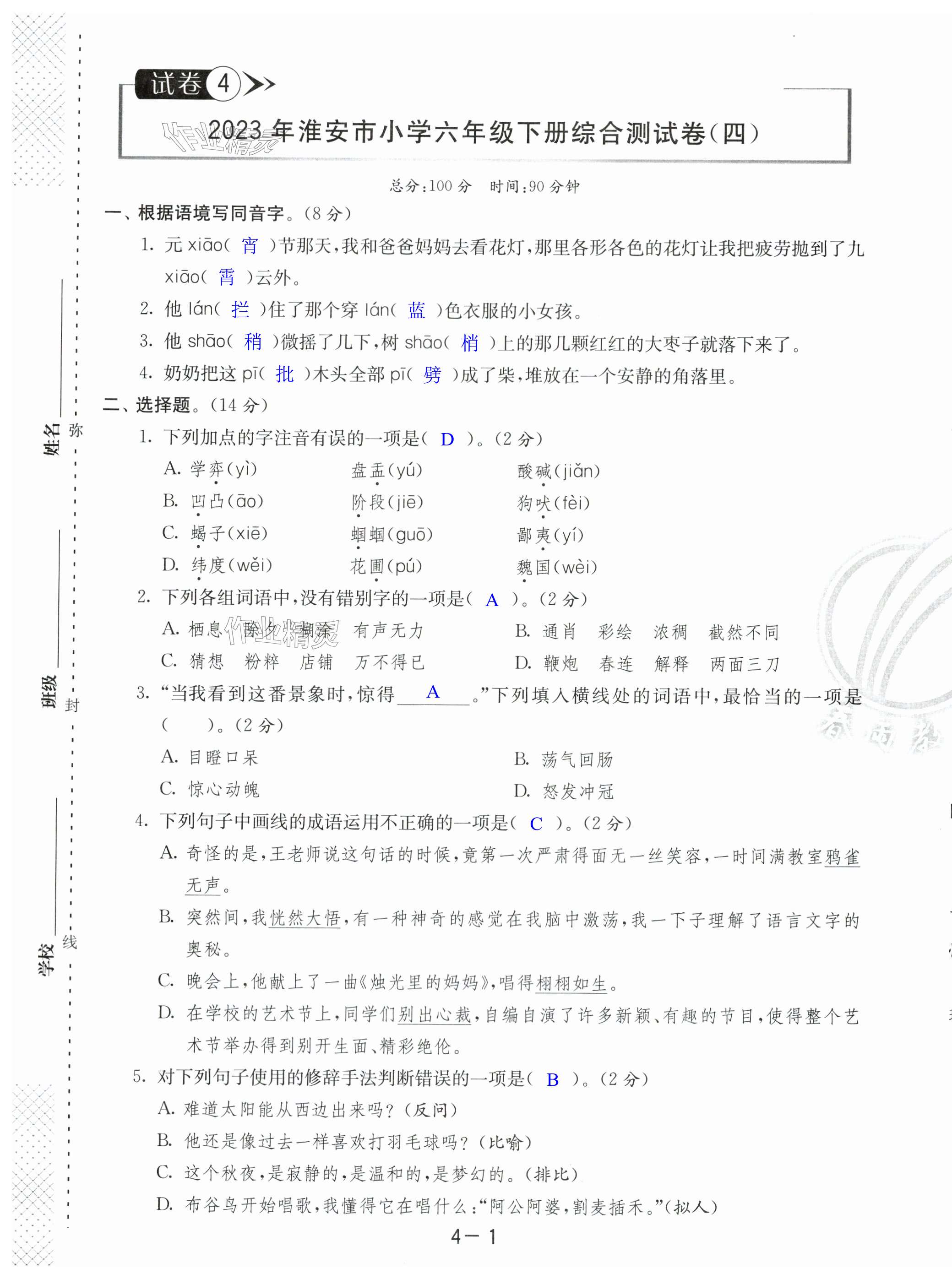注:目前有些书本章节名称可能整理的还不是很完善,但都是按照顺序排列的,请同学们按照顺序仔细查找。练习册 2024年考必胜小学毕业升学考试试卷精选语文淮安专版 答案主要是用来给同学们做完题方便对答案用的,请勿直接抄袭。