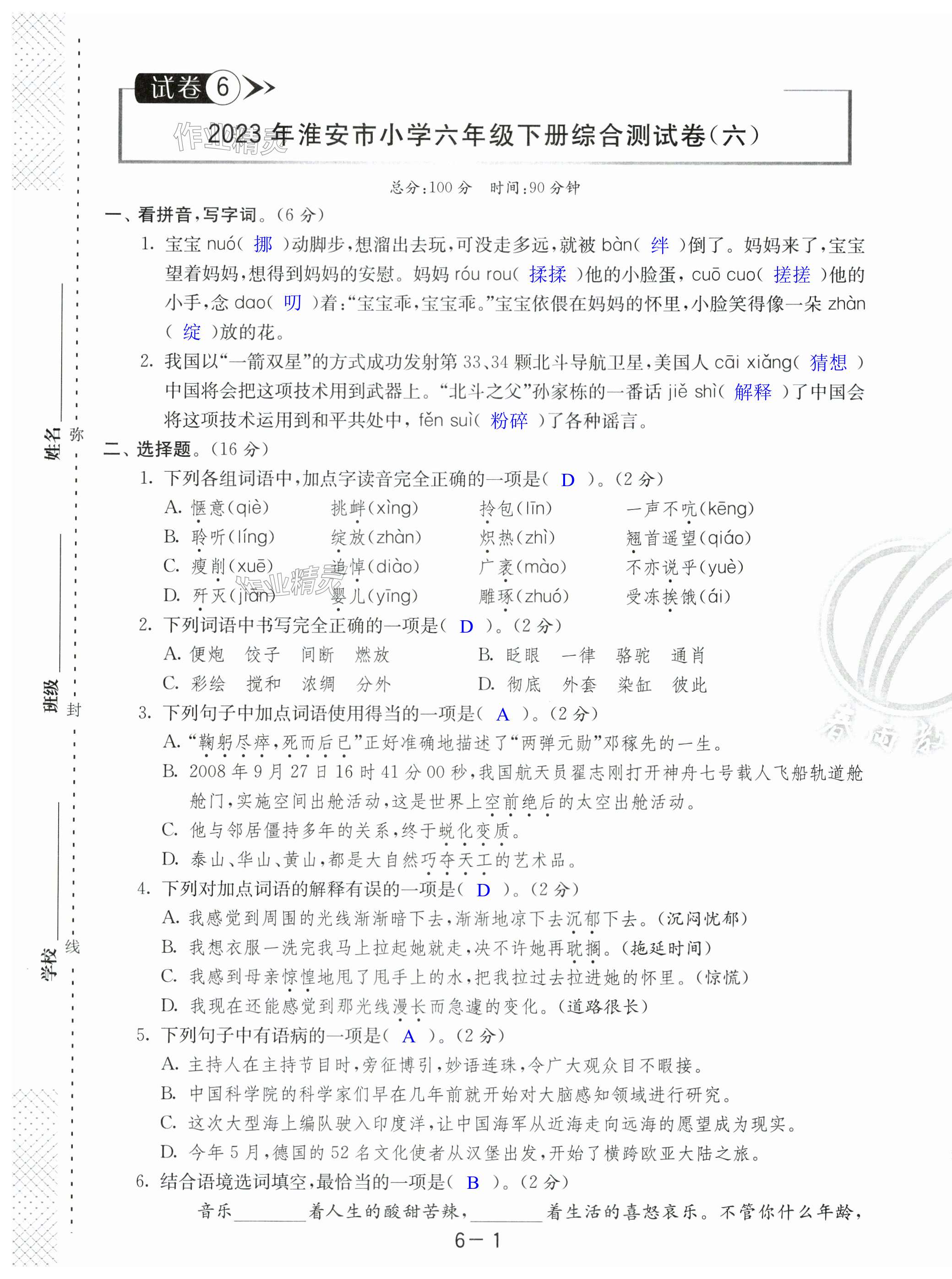注:目前有些书本章节名称可能整理的还不是很完善,但都是按照顺序排列的,请同学们按照顺序仔细查找。练习册 2024年考必胜小学毕业升学考试试卷精选语文淮安专版 答案主要是用来给同学们做完题方便对答案用的,请勿直接抄袭。