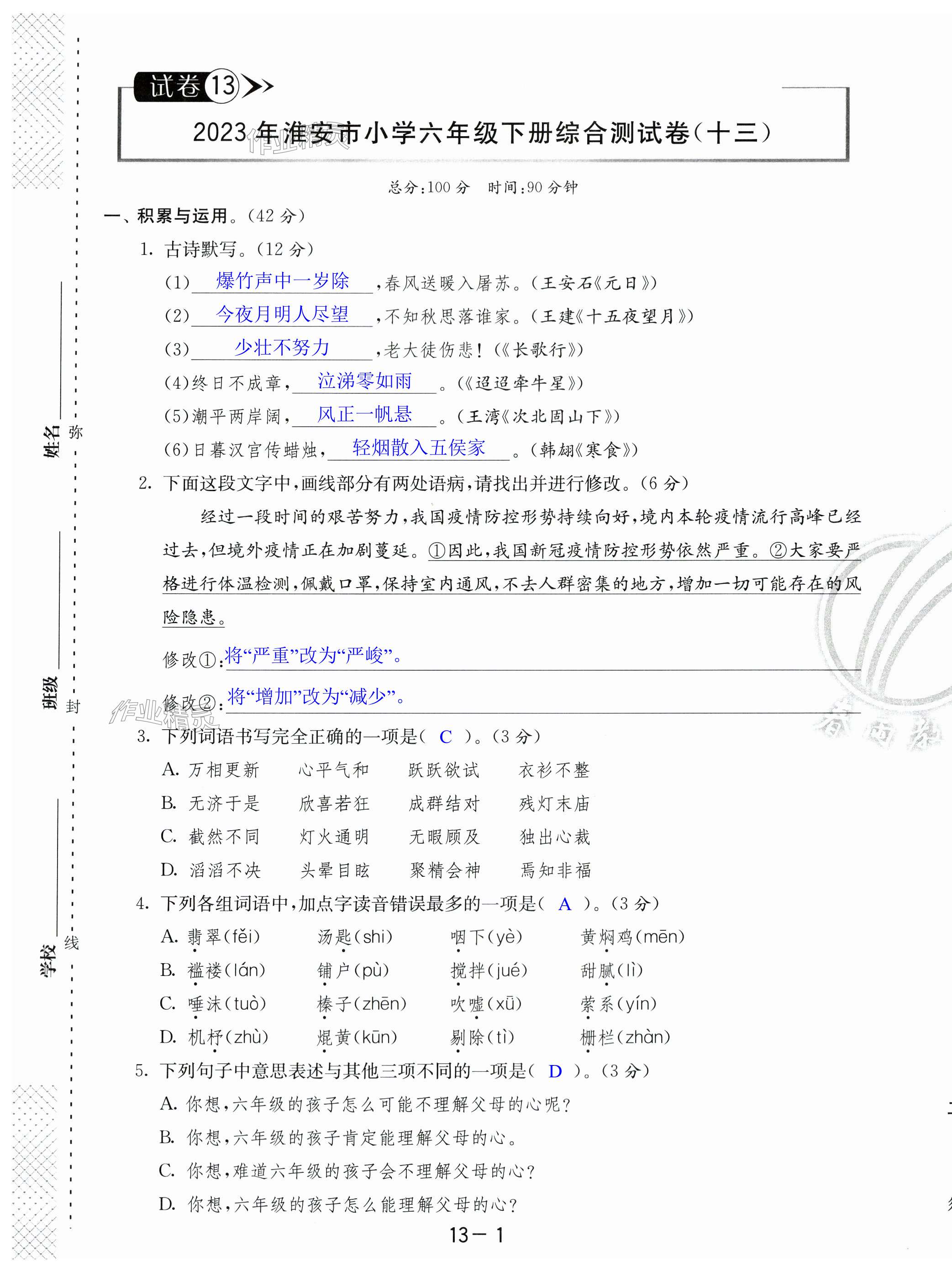 注:目前有些书本章节名称可能整理的还不是很完善,但都是按照顺序排列的,请同学们按照顺序仔细查找。练习册 2024年考必胜小学毕业升学考试试卷精选语文淮安专版 答案主要是用来给同学们做完题方便对答案用的,请勿直接抄袭。