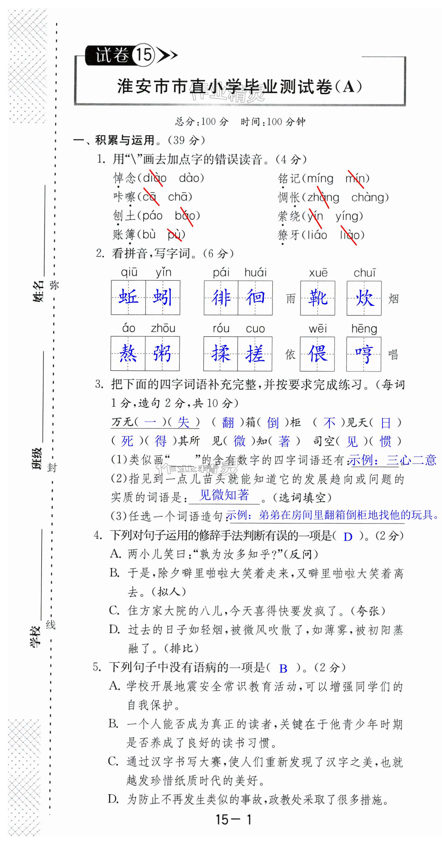 注:目前有些书本章节名称可能整理的还不是很完善,但都是按照顺序排列的,请同学们按照顺序仔细查找。练习册 2024年考必胜小学毕业升学考试试卷精选语文淮安专版 答案主要是用来给同学们做完题方便对答案用的,请勿直接抄袭。