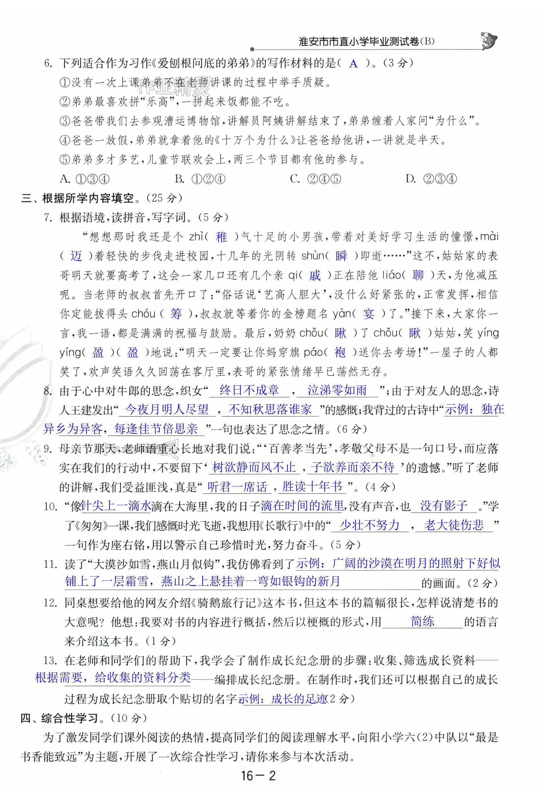 注:目前有些书本章节名称可能整理的还不是很完善,但都是按照顺序排列的,请同学们按照顺序仔细查找。练习册 2024年考必胜小学毕业升学考试试卷精选语文淮安专版 答案主要是用来给同学们做完题方便对答案用的,请勿直接抄袭。
