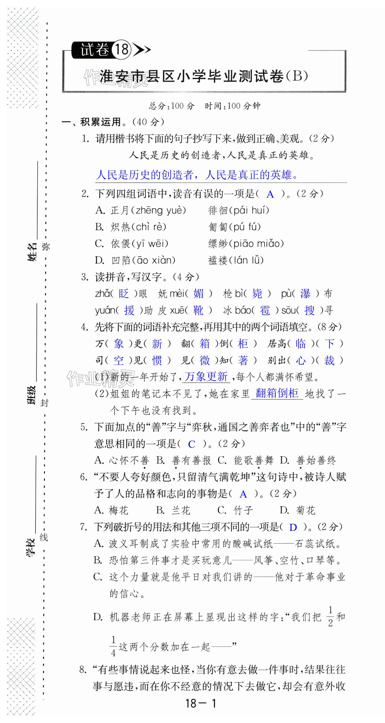 注:目前有些书本章节名称可能整理的还不是很完善,但都是按照顺序排列的,请同学们按照顺序仔细查找。练习册 2024年考必胜小学毕业升学考试试卷精选语文淮安专版 答案主要是用来给同学们做完题方便对答案用的,请勿直接抄袭。