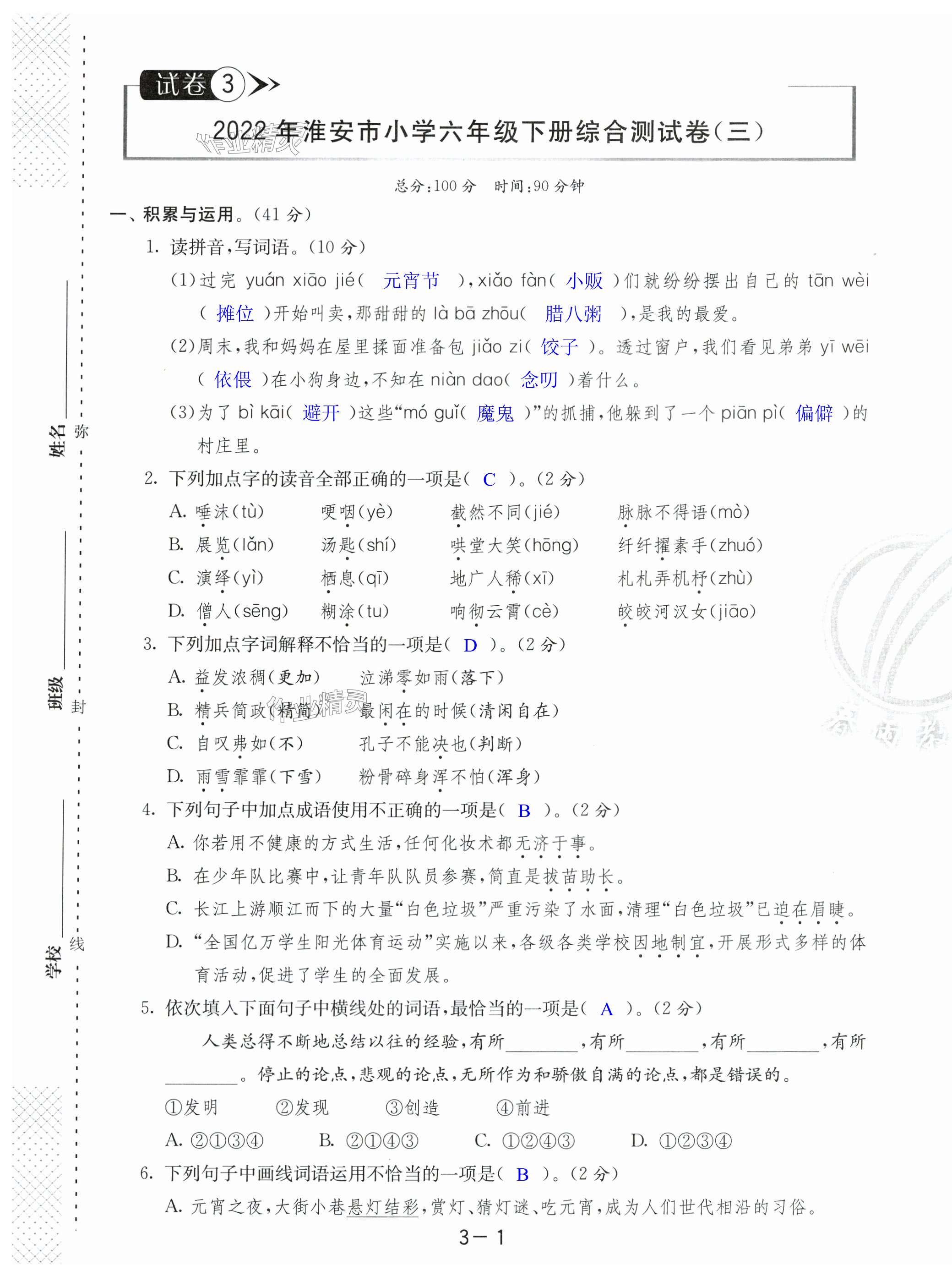 注:目前有些书本章节名称可能整理的还不是很完善,但都是按照顺序排列的,请同学们按照顺序仔细查找。练习册 2024年考必胜小学毕业升学考试试卷精选语文淮安专版 答案主要是用来给同学们做完题方便对答案用的,请勿直接抄袭。