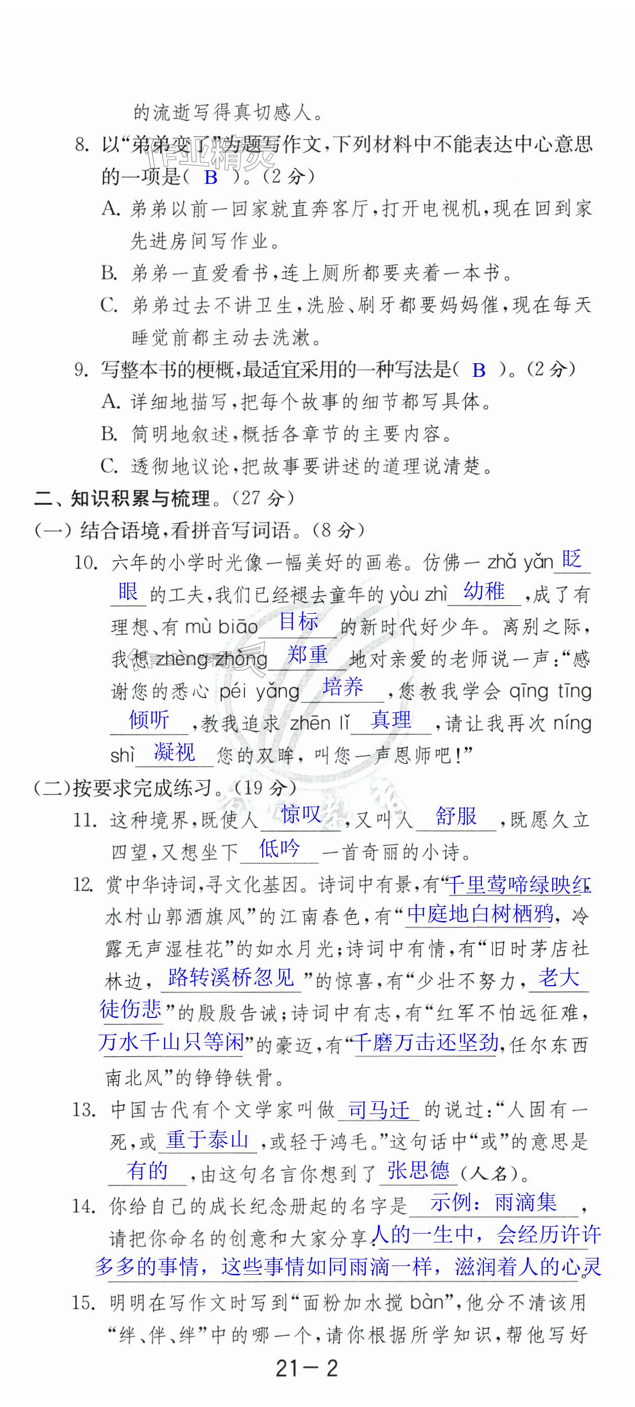 注:目前有些书本章节名称可能整理的还不是很完善,但都是按照顺序排列的,请同学们按照顺序仔细查找。练习册 2024年考必胜小学毕业升学考试试卷精选语文淮安专版 答案主要是用来给同学们做完题方便对答案用的,请勿直接抄袭。