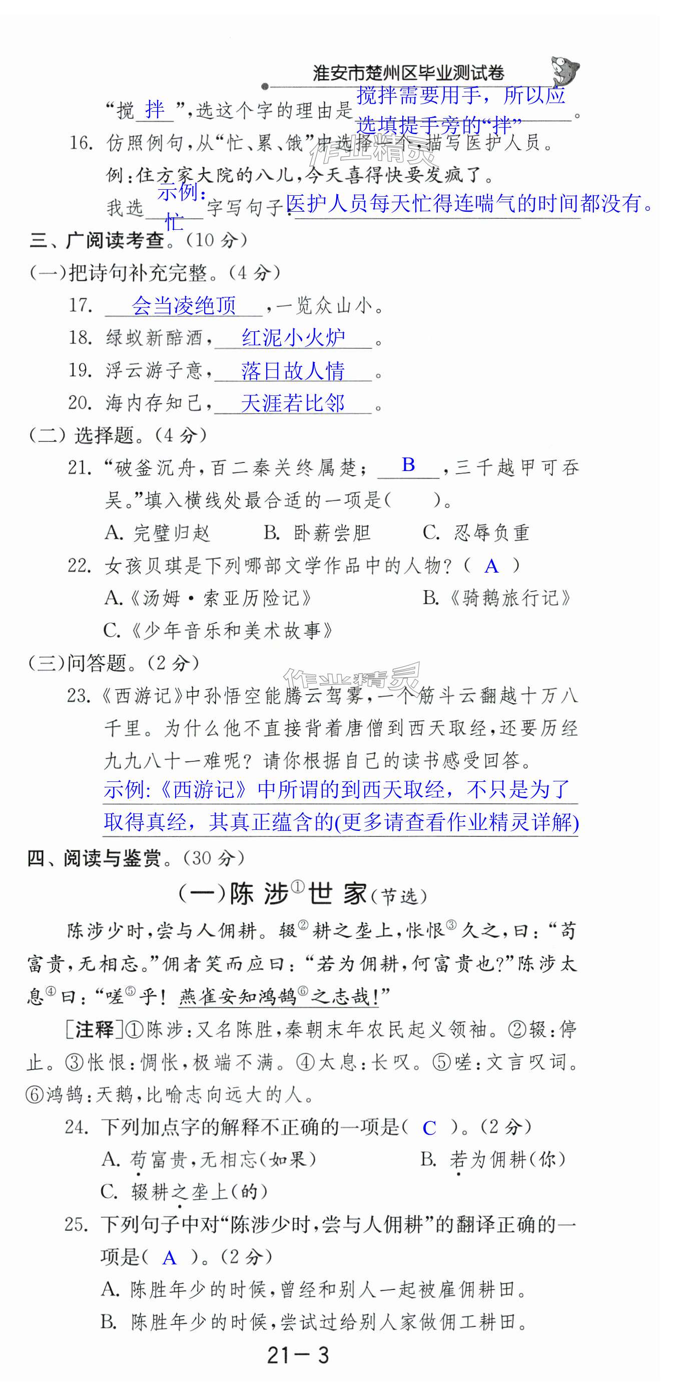注:目前有些书本章节名称可能整理的还不是很完善,但都是按照顺序排列的,请同学们按照顺序仔细查找。练习册 2024年考必胜小学毕业升学考试试卷精选语文淮安专版 答案主要是用来给同学们做完题方便对答案用的,请勿直接抄袭。