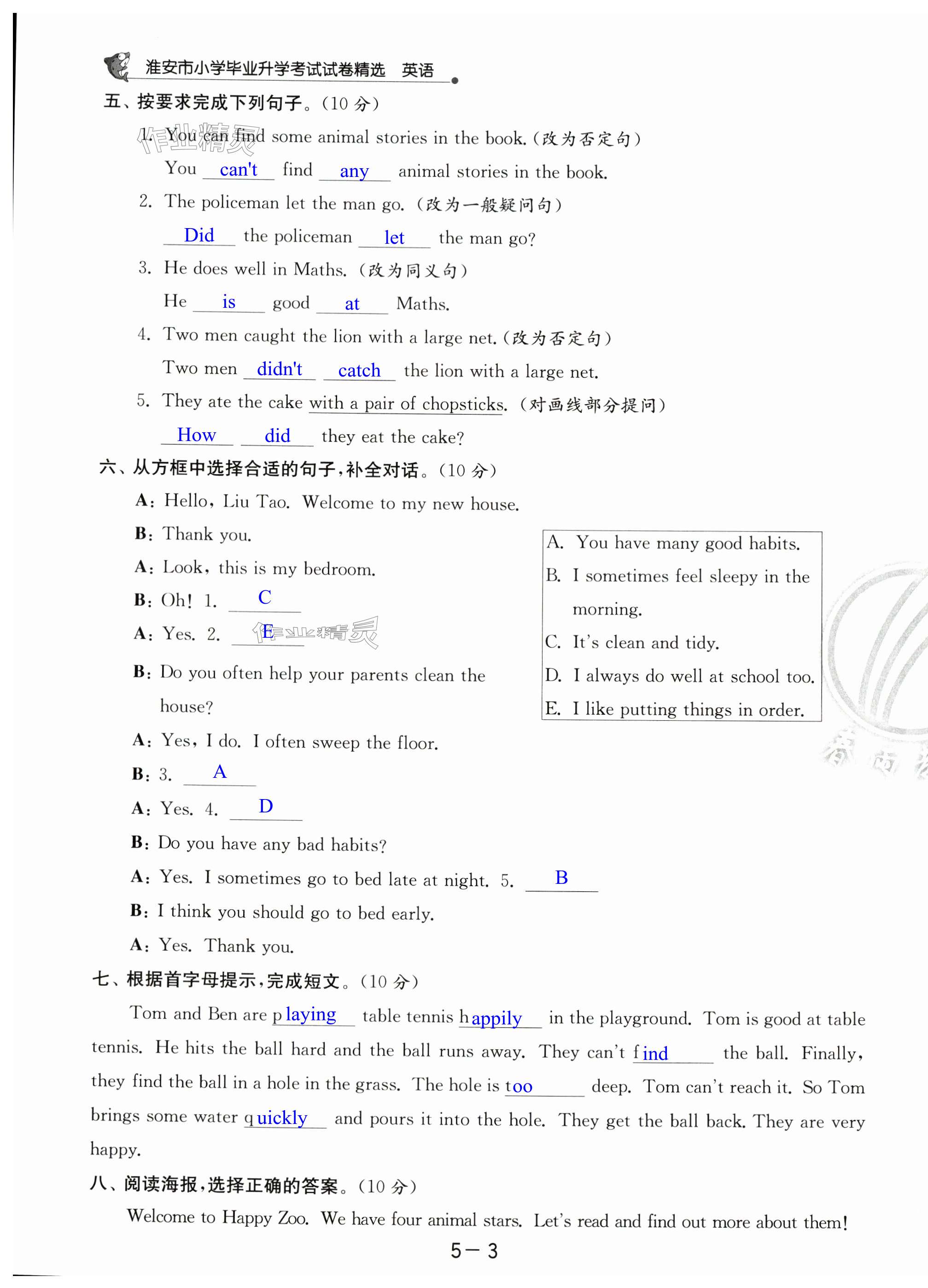 注:目前有些书本章节名称可能整理的还不是很完善,但都是按照顺序排列的,请同学们按照顺序仔细查找。练习册 2024年考必胜小学毕业升学考试试卷精选六年级英语淮安专版 答案主要是用来给同学们做完题方便对答案用的,请勿直接抄袭。