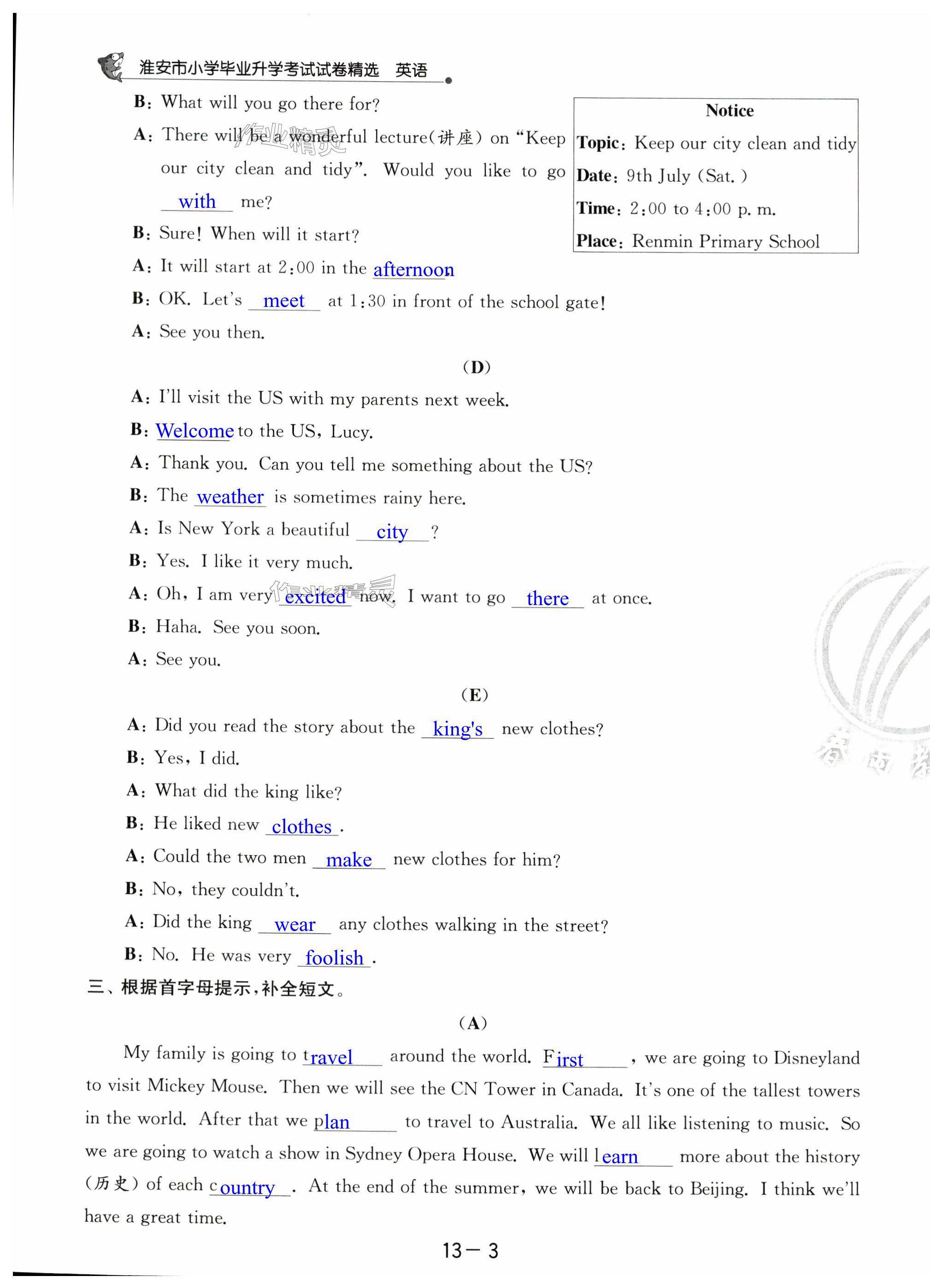 注:目前有些书本章节名称可能整理的还不是很完善,但都是按照顺序排列的,请同学们按照顺序仔细查找。练习册 2024年考必胜小学毕业升学考试试卷精选六年级英语淮安专版 答案主要是用来给同学们做完题方便对答案用的,请勿直接抄袭。