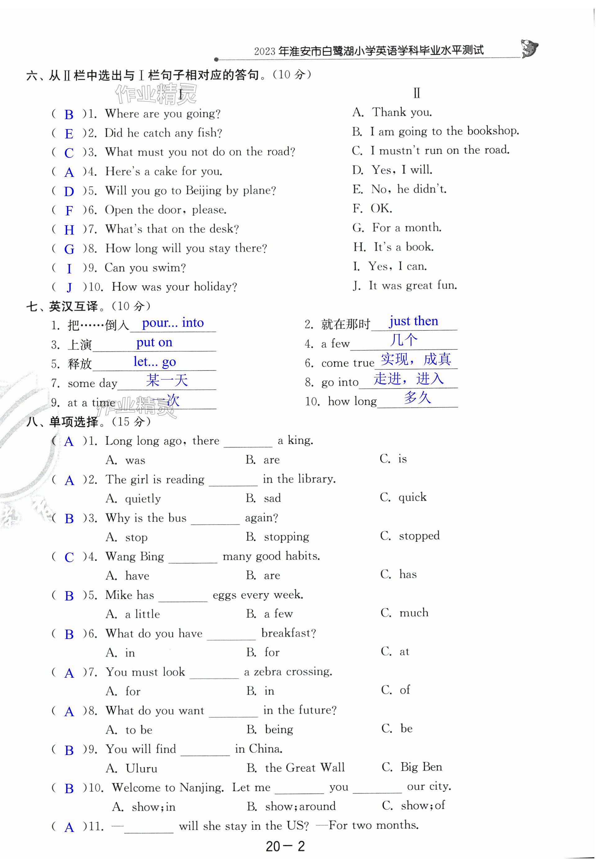 注:目前有些书本章节名称可能整理的还不是很完善,但都是按照顺序排列的,请同学们按照顺序仔细查找。练习册 2024年考必胜小学毕业升学考试试卷精选六年级英语淮安专版 答案主要是用来给同学们做完题方便对答案用的,请勿直接抄袭。