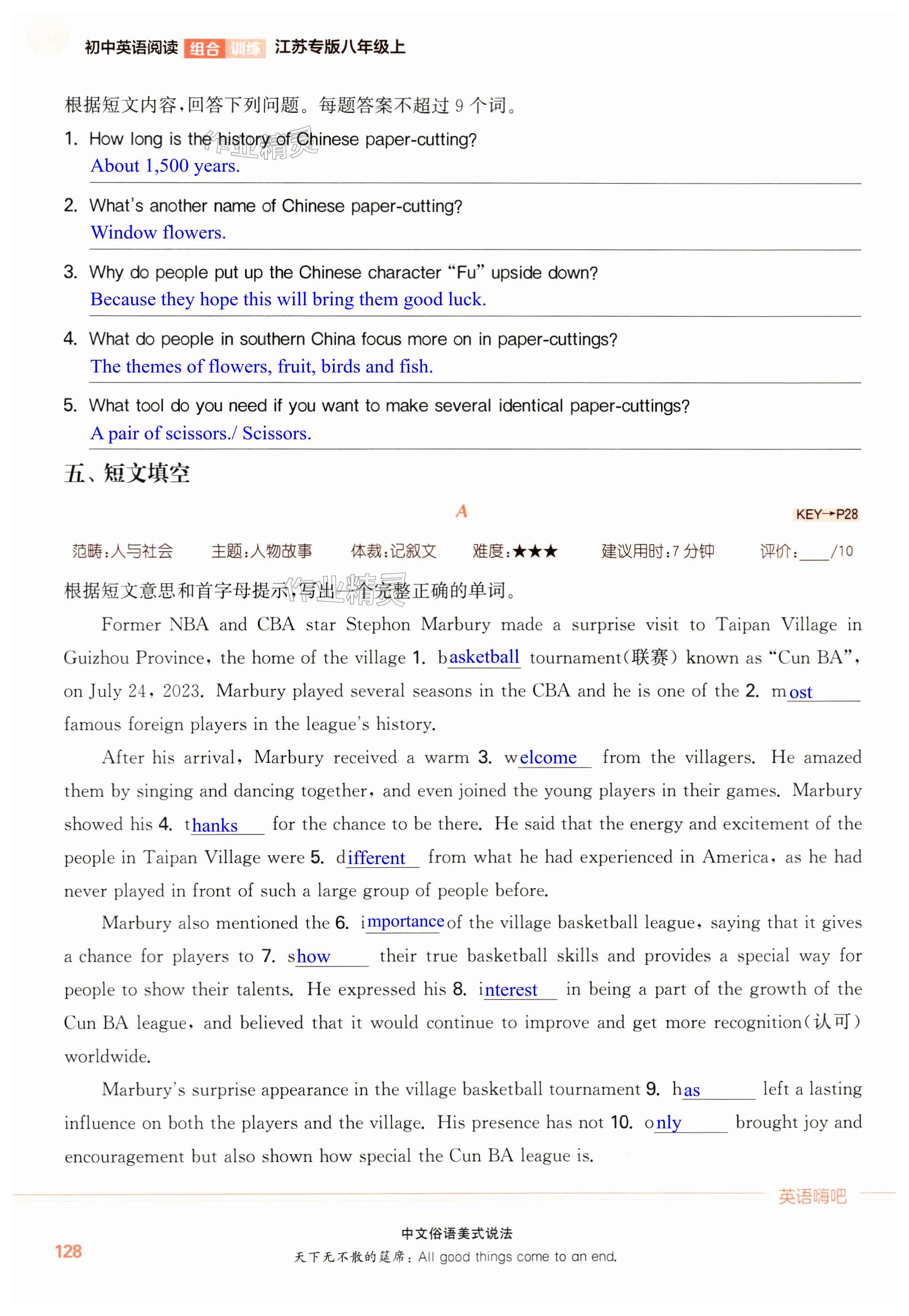 注:目前有些书本章节名称可能整理的还不是很完善,但都是按照顺序排列的,请同学们按照顺序仔细查找。练习册 2024年通城学典初中英语阅读组合训练八年级上册江苏专版 答案主要是用来给同学们做完题方便对答案用的,请勿直接抄袭。