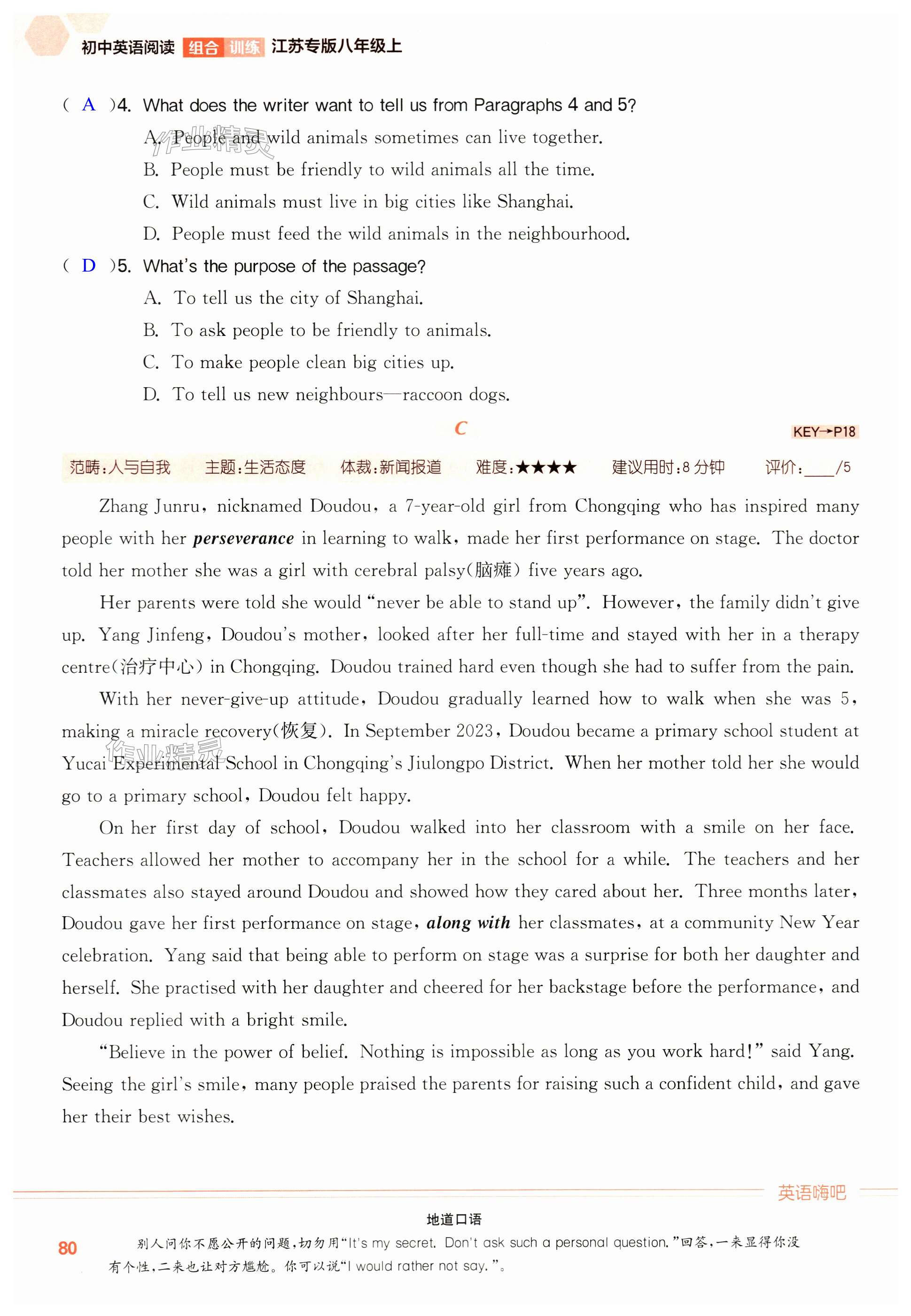 2024年通城学典初中英语阅读组合训练八年级上册江苏专版