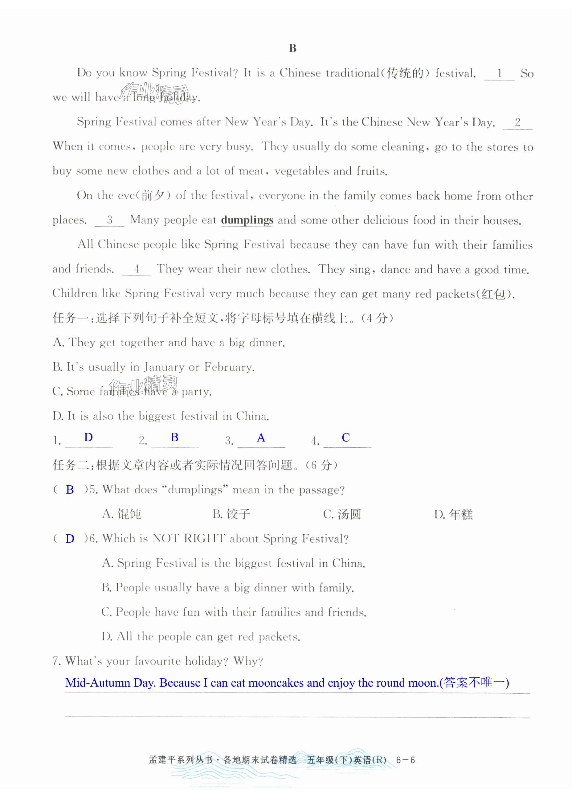 注:目前有些书本章节名称可能整理的还不是很完善,但都是按照顺序排列的,请同学们按照顺序仔细查找。练习册 2024年孟建平各地期末试卷精选五年级英语下册人教版 答案主要是用来给同学们做完题方便对答案用的,请勿直接抄袭。