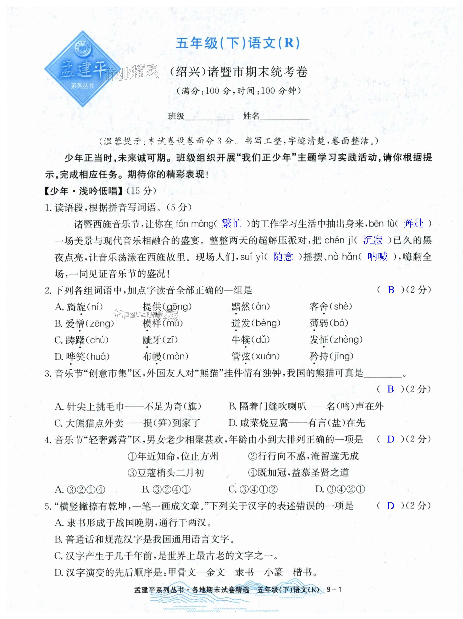 注:目前有些书本章节名称可能整理的还不是很完善,但都是按照顺序排列的,请同学们按照顺序仔细查找。练习册 2024年孟建平各地期末试卷精选五年级语文下册人教版 答案主要是用来给同学们做完题方便对答案用的,请勿直接抄袭。