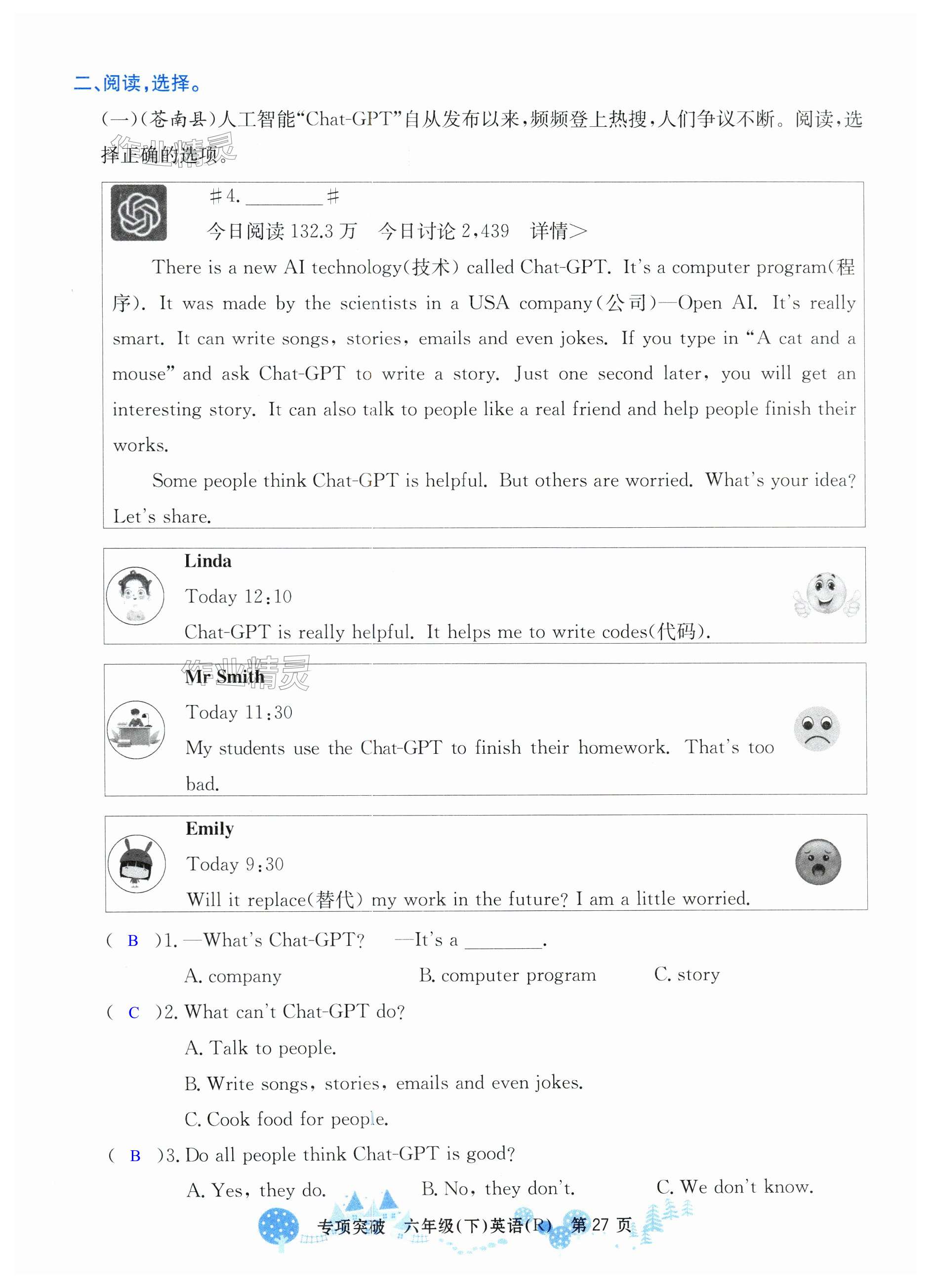 注:目前有些书本章节名称可能整理的还不是很完善,但都是按照顺序排列的,请同学们按照顺序仔细查找。练习册 2024年孟建平各地期末试卷精选六年级英语下册人教版 答案主要是用来给同学们做完题方便对答案用的,请勿直接抄袭。