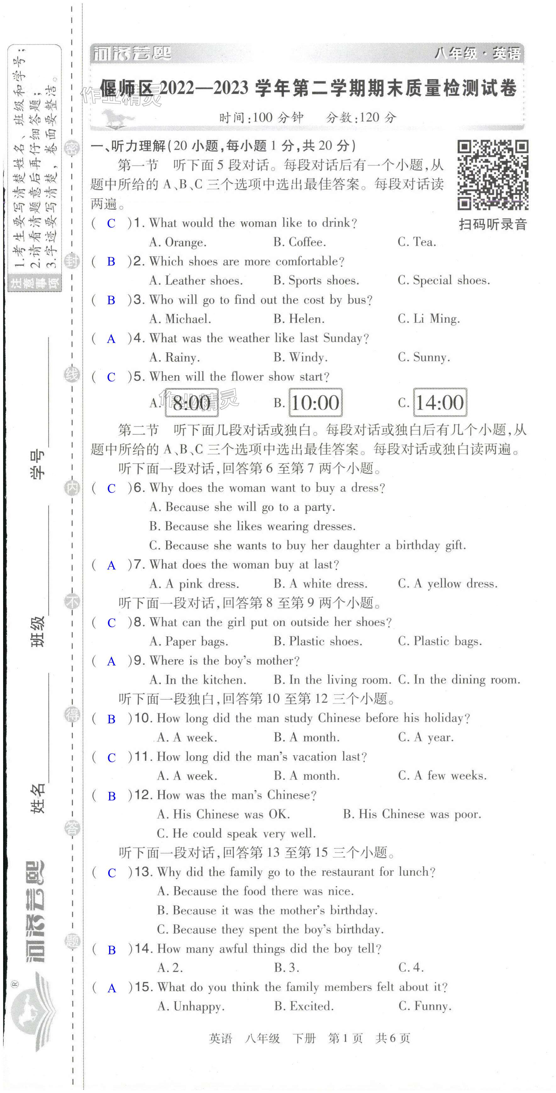 注:目前有些书本章节名称可能整理的还不是很完善,但都是按照顺序排列的,请同学们按照顺序仔细查找。练习册 2024年期末考试必刷卷八年级英语下册人教版洛阳专版 答案主要是用来给同学们做完题方便对答案用的,请勿直接抄袭。