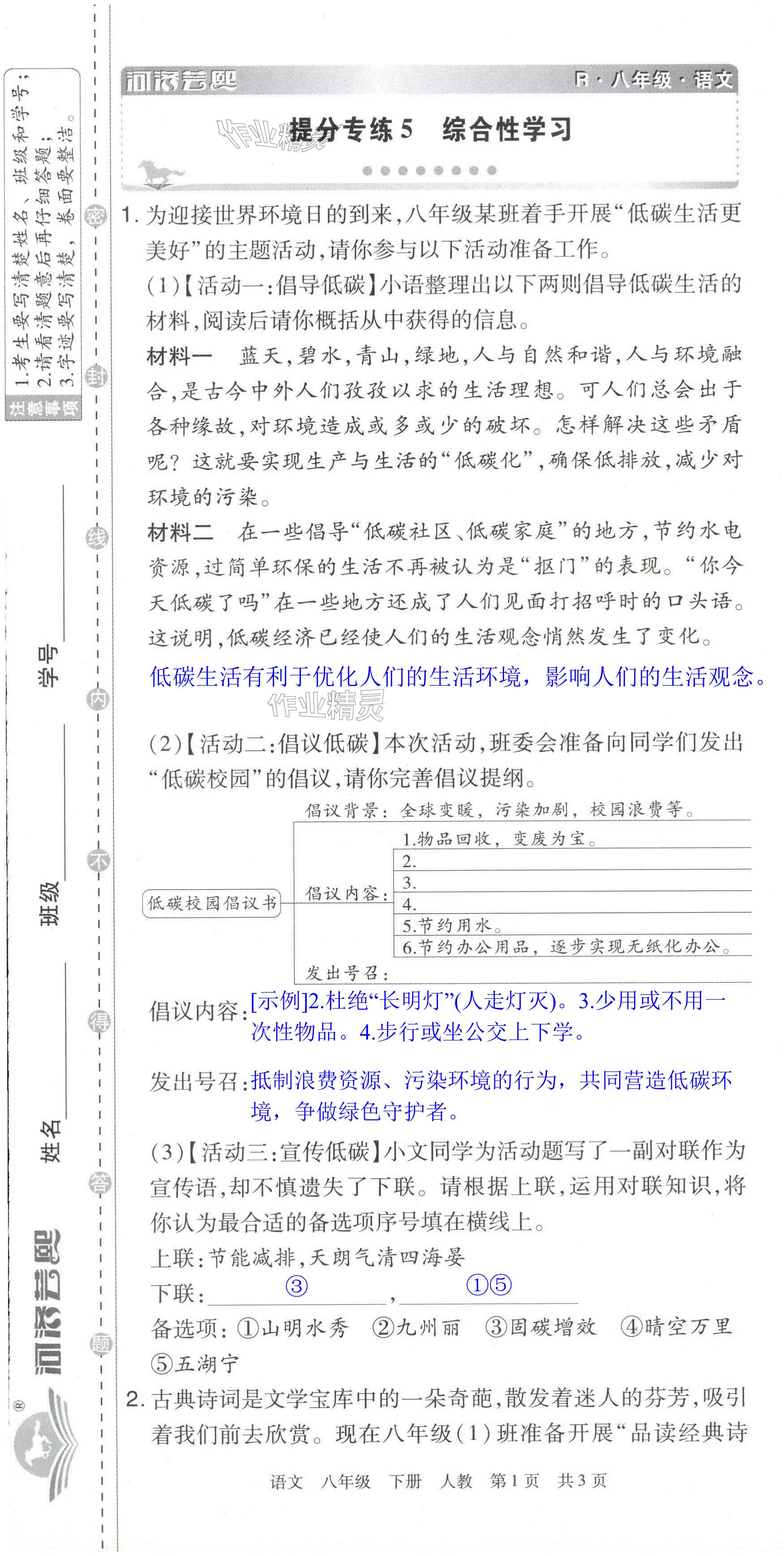 注:目前有些书本章节名称可能整理的还不是很完善,但都是按照顺序排列的,请同学们按照顺序仔细查找。练习册 2024年期末考试必刷卷八年级语文下册人教版洛阳专版 答案主要是用来给同学们做完题方便对答案用的,请勿直接抄袭。