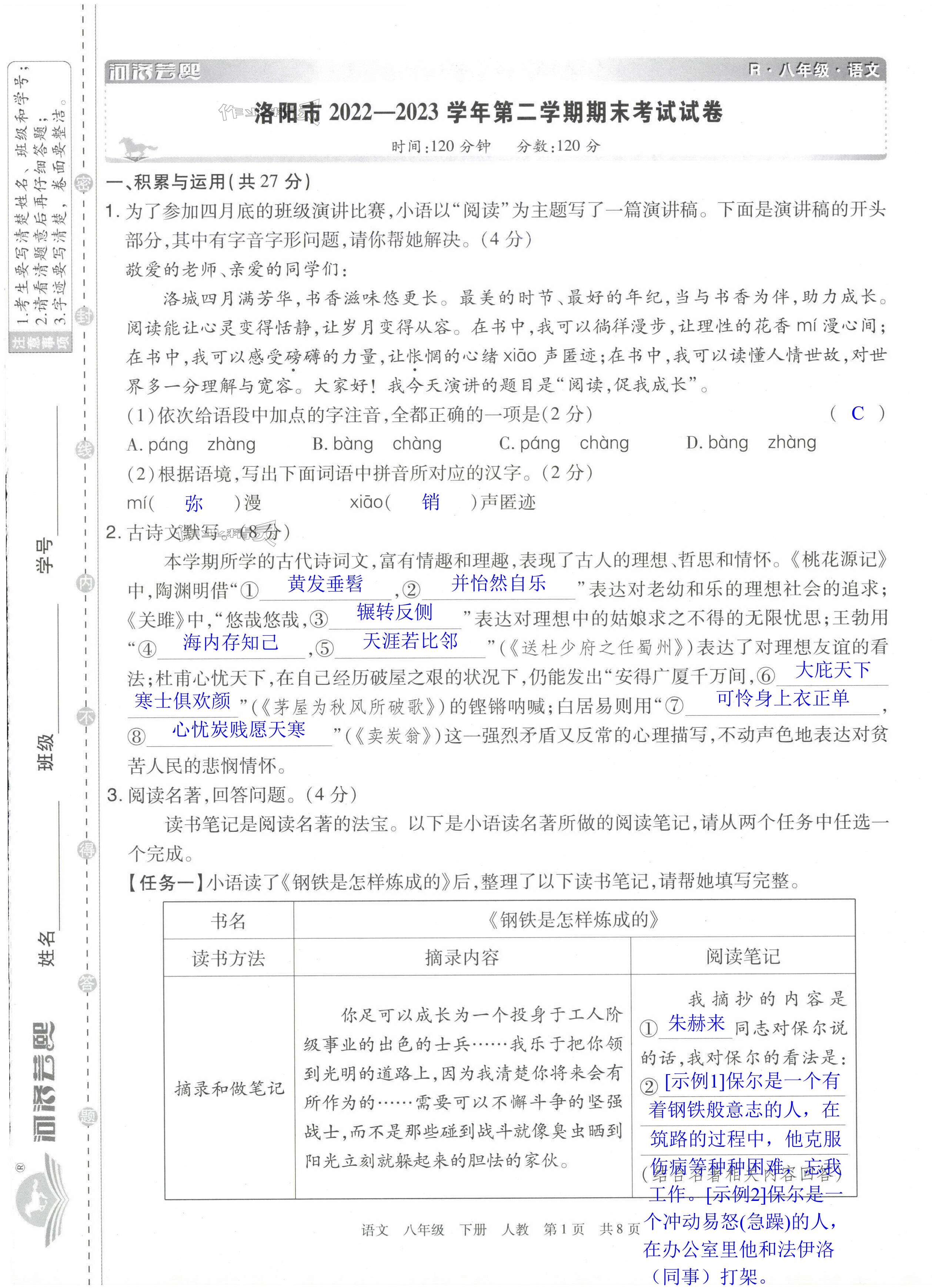 注:目前有些书本章节名称可能整理的还不是很完善,但都是按照顺序排列的,请同学们按照顺序仔细查找。练习册 2024年期末考试必刷卷八年级语文下册人教版洛阳专版 答案主要是用来给同学们做完题方便对答案用的,请勿直接抄袭。