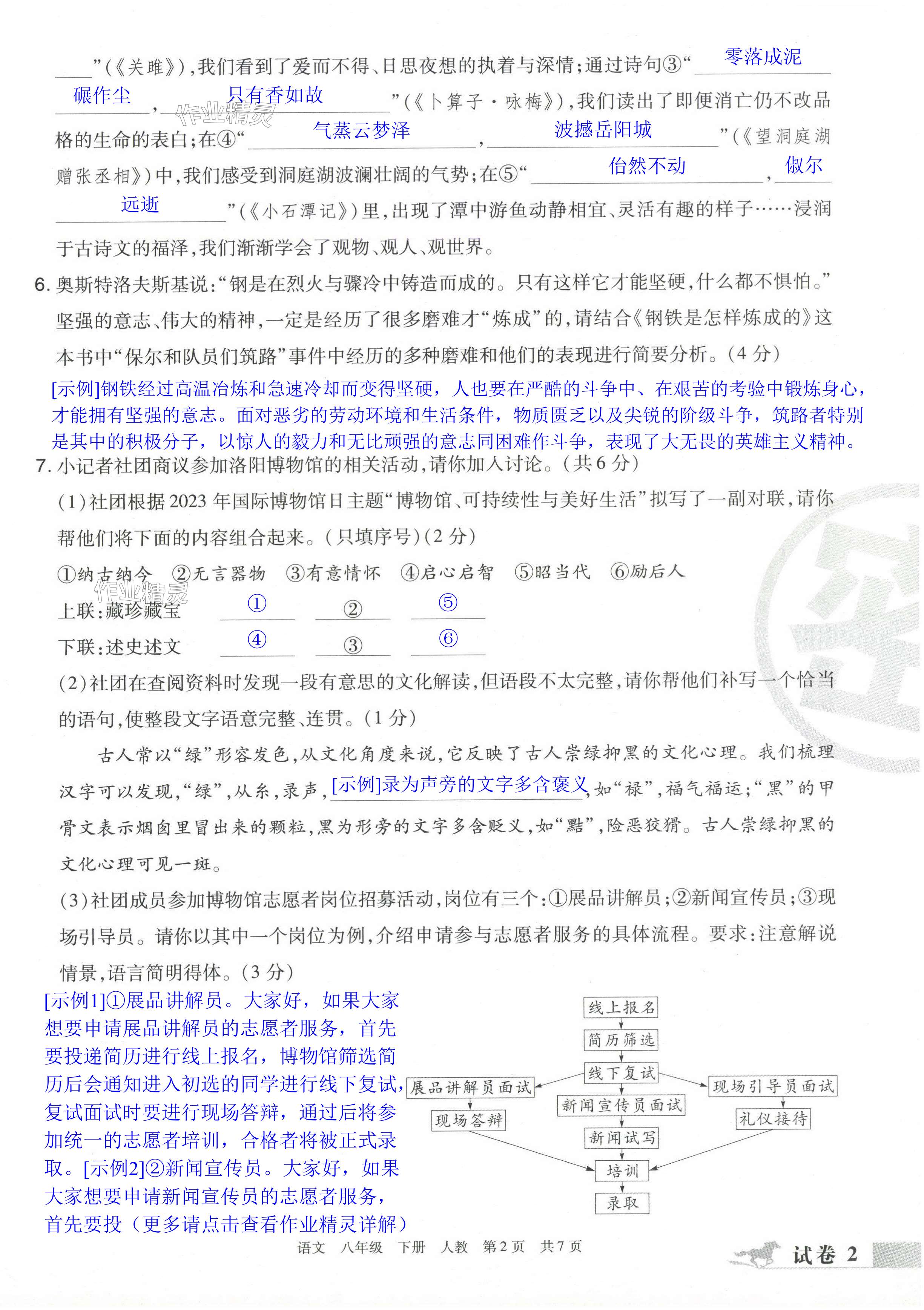 注:目前有些书本章节名称可能整理的还不是很完善,但都是按照顺序排列的,请同学们按照顺序仔细查找。练习册 2024年期末考试必刷卷八年级语文下册人教版洛阳专版 答案主要是用来给同学们做完题方便对答案用的,请勿直接抄袭。
