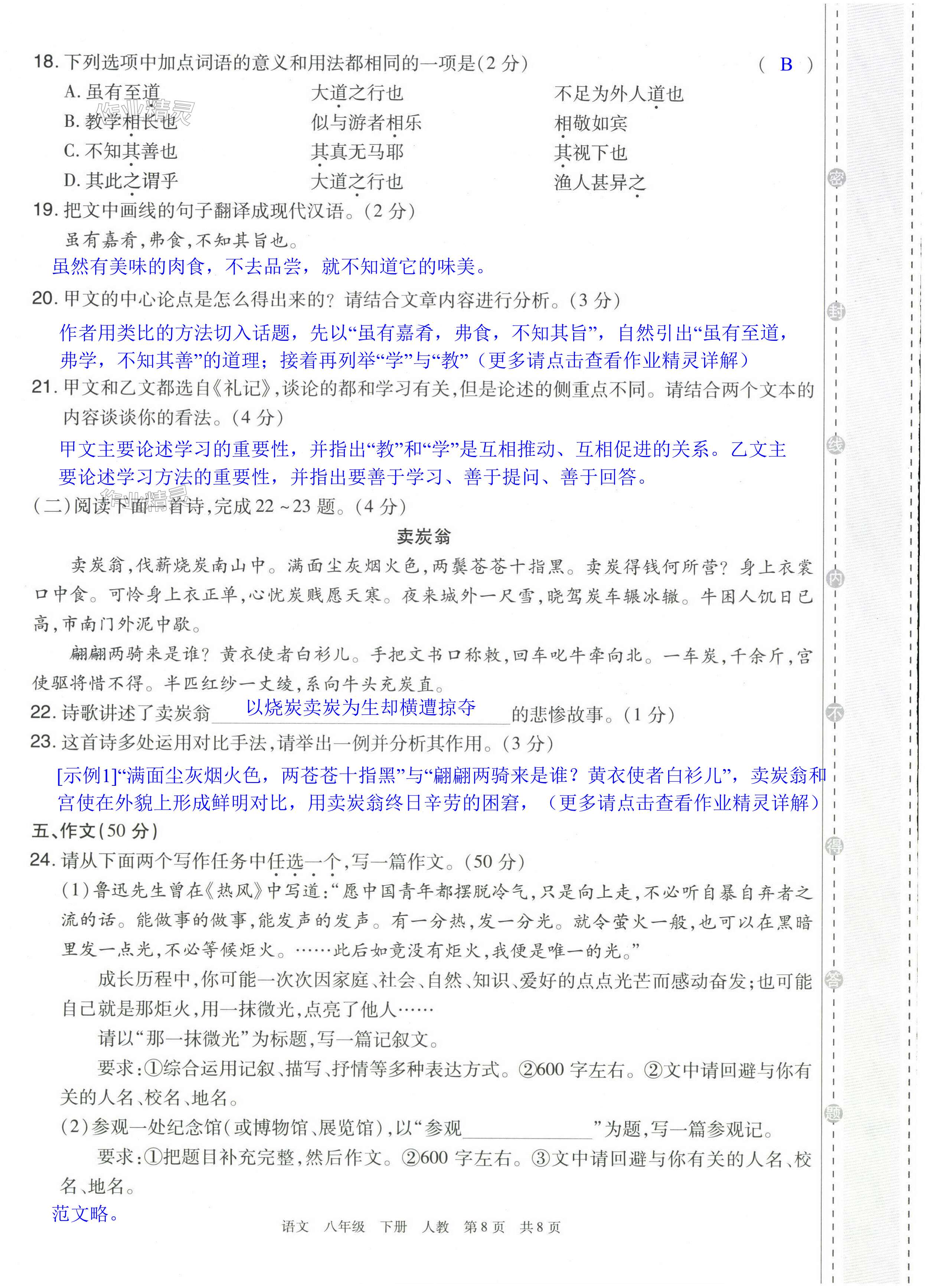 注:目前有些书本章节名称可能整理的还不是很完善,但都是按照顺序排列的,请同学们按照顺序仔细查找。练习册 2024年期末考试必刷卷八年级语文下册人教版洛阳专版 答案主要是用来给同学们做完题方便对答案用的,请勿直接抄袭。