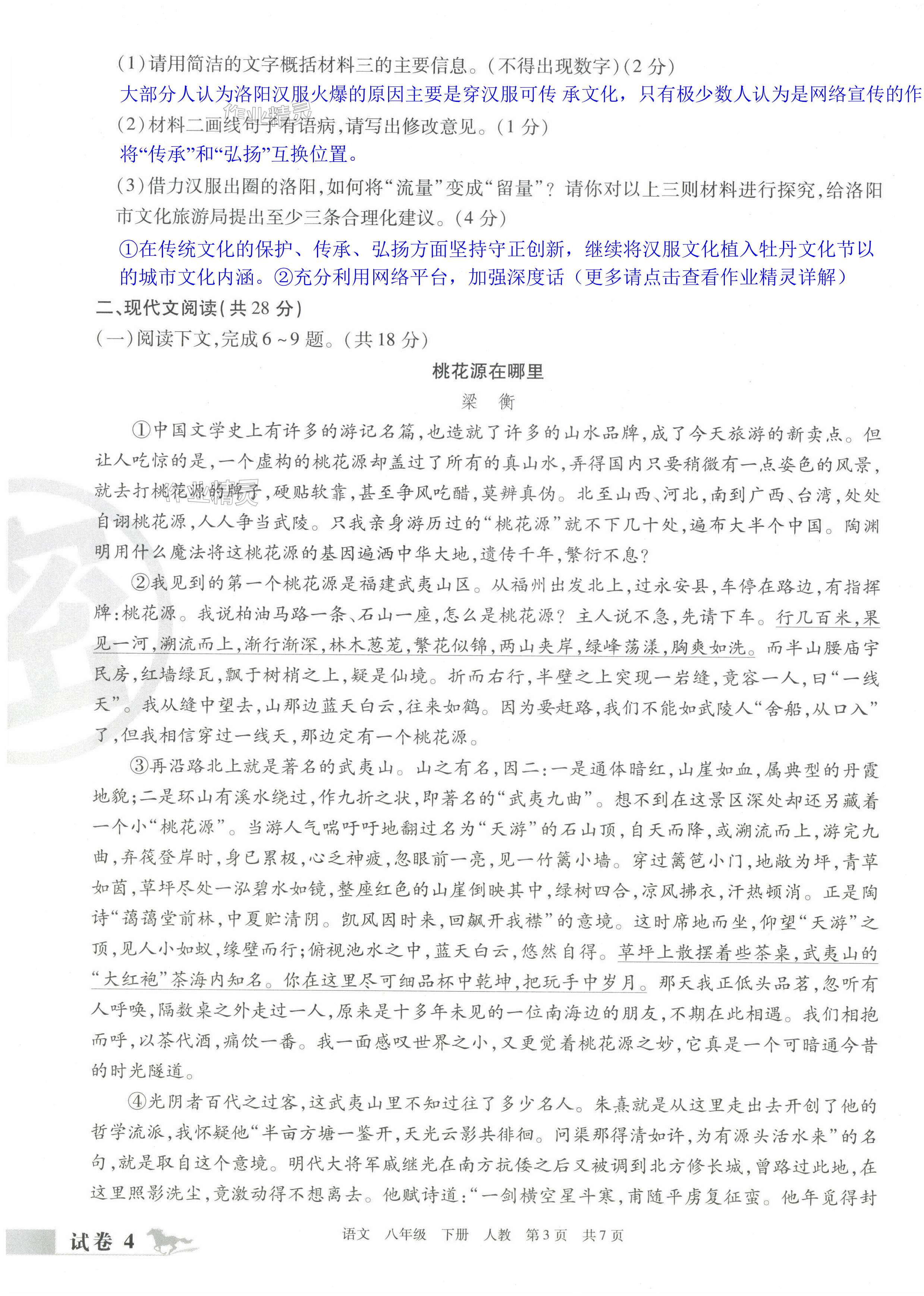 注:目前有些书本章节名称可能整理的还不是很完善,但都是按照顺序排列的,请同学们按照顺序仔细查找。练习册 2024年期末考试必刷卷八年级语文下册人教版洛阳专版 答案主要是用来给同学们做完题方便对答案用的,请勿直接抄袭。