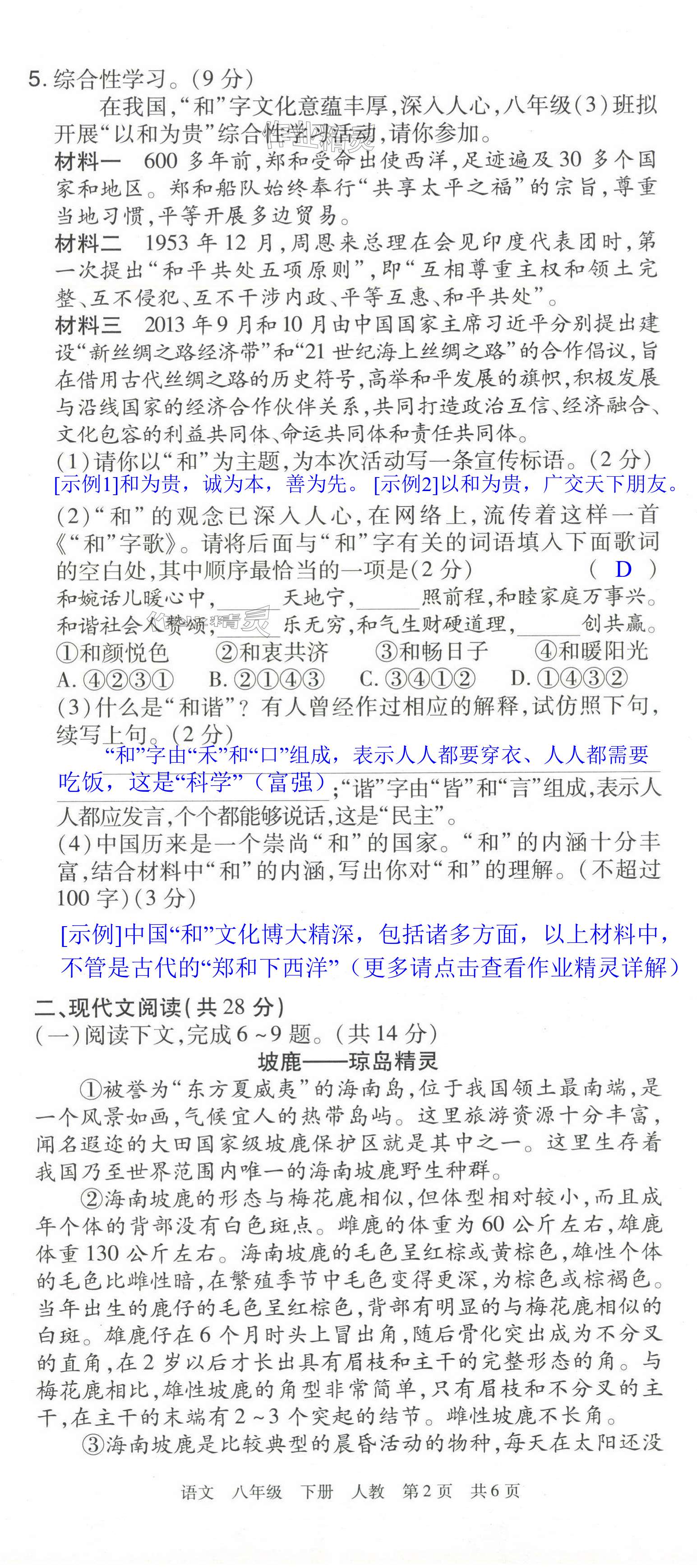注:目前有些书本章节名称可能整理的还不是很完善,但都是按照顺序排列的,请同学们按照顺序仔细查找。练习册 2024年期末考试必刷卷八年级语文下册人教版洛阳专版 答案主要是用来给同学们做完题方便对答案用的,请勿直接抄袭。