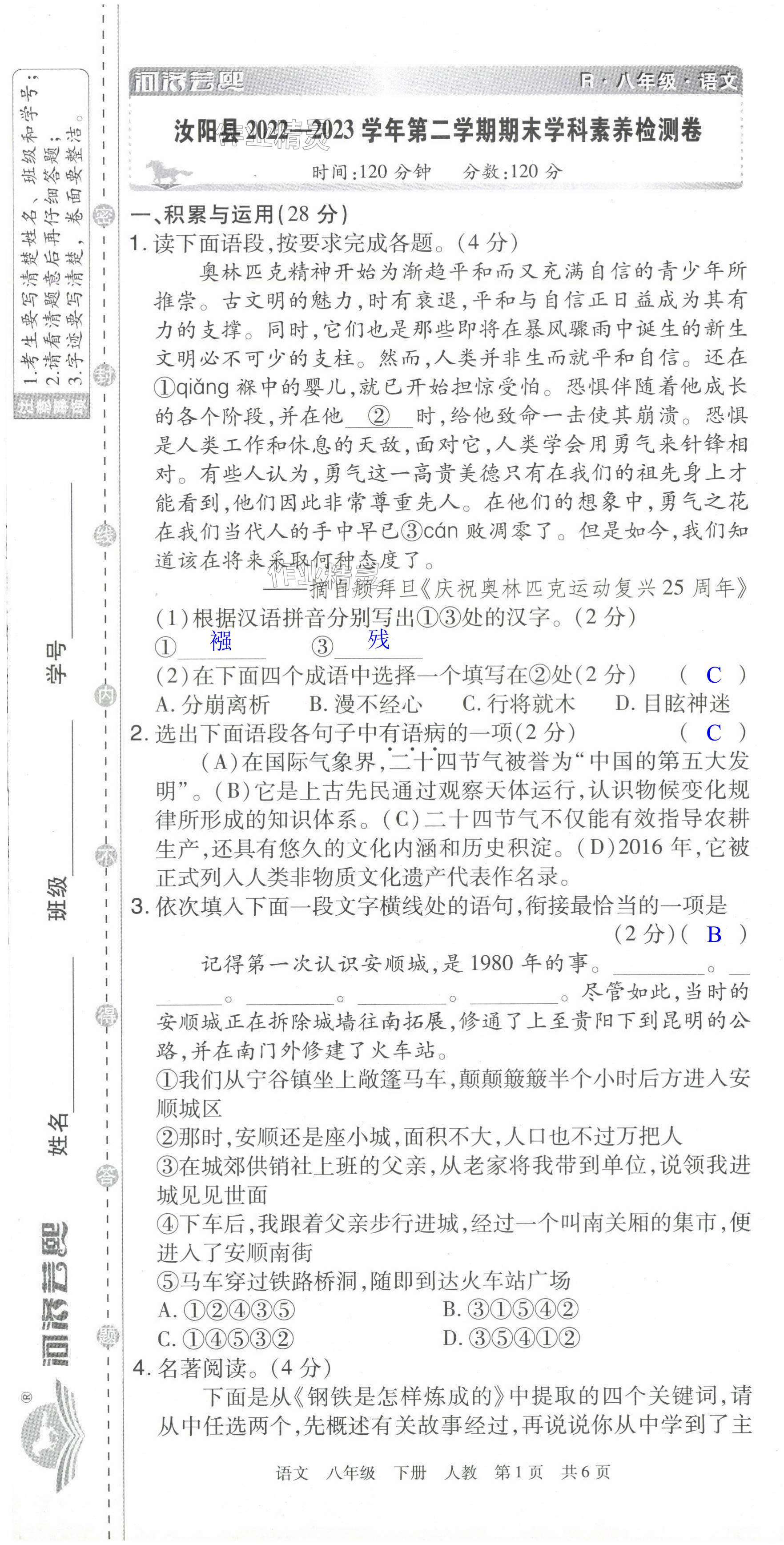 注:目前有些书本章节名称可能整理的还不是很完善,但都是按照顺序排列的,请同学们按照顺序仔细查找。练习册 2024年期末考试必刷卷八年级语文下册人教版洛阳专版 答案主要是用来给同学们做完题方便对答案用的,请勿直接抄袭。