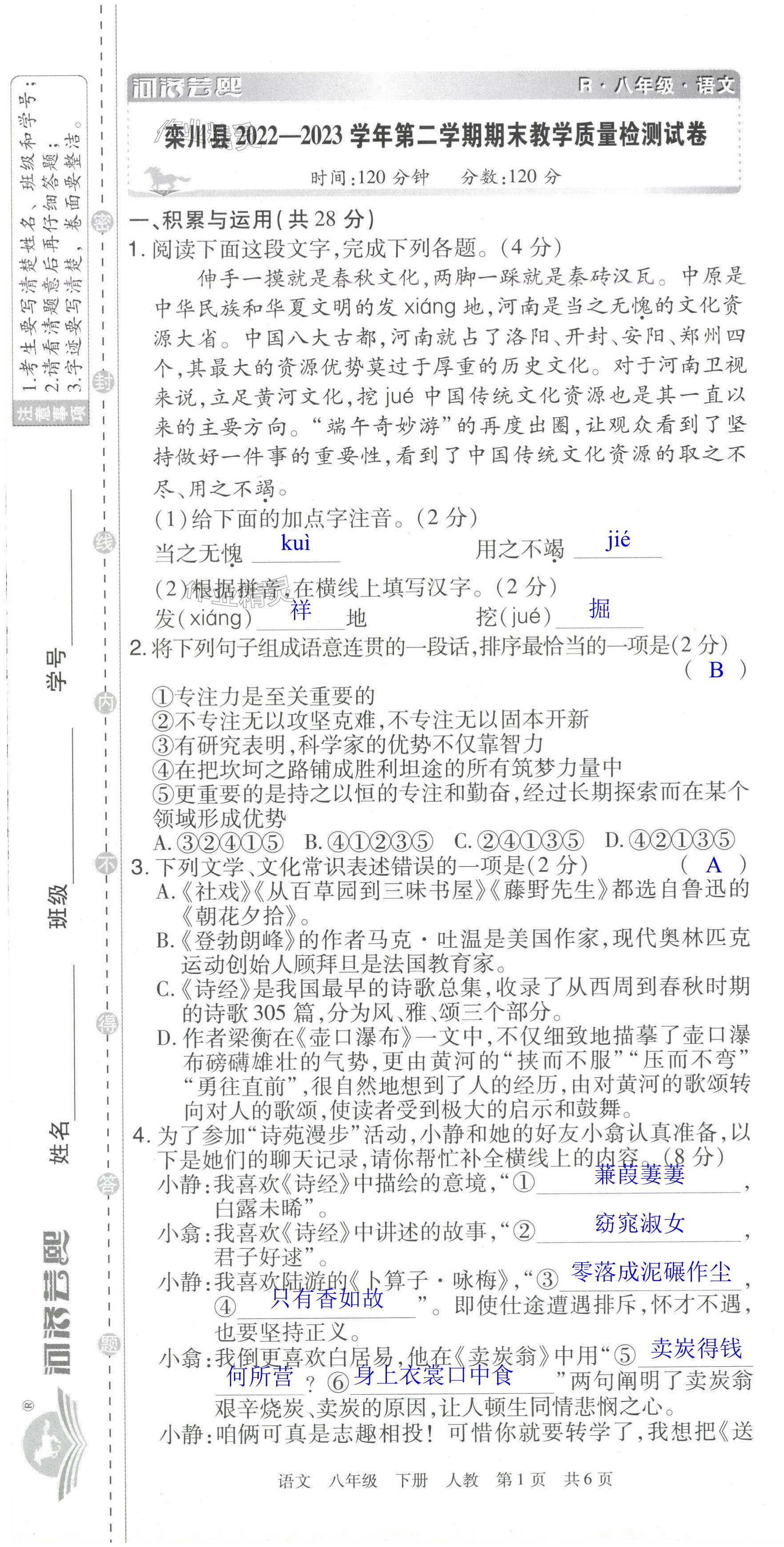 注:目前有些书本章节名称可能整理的还不是很完善,但都是按照顺序排列的,请同学们按照顺序仔细查找。练习册 2024年期末考试必刷卷八年级语文下册人教版洛阳专版 答案主要是用来给同学们做完题方便对答案用的,请勿直接抄袭。