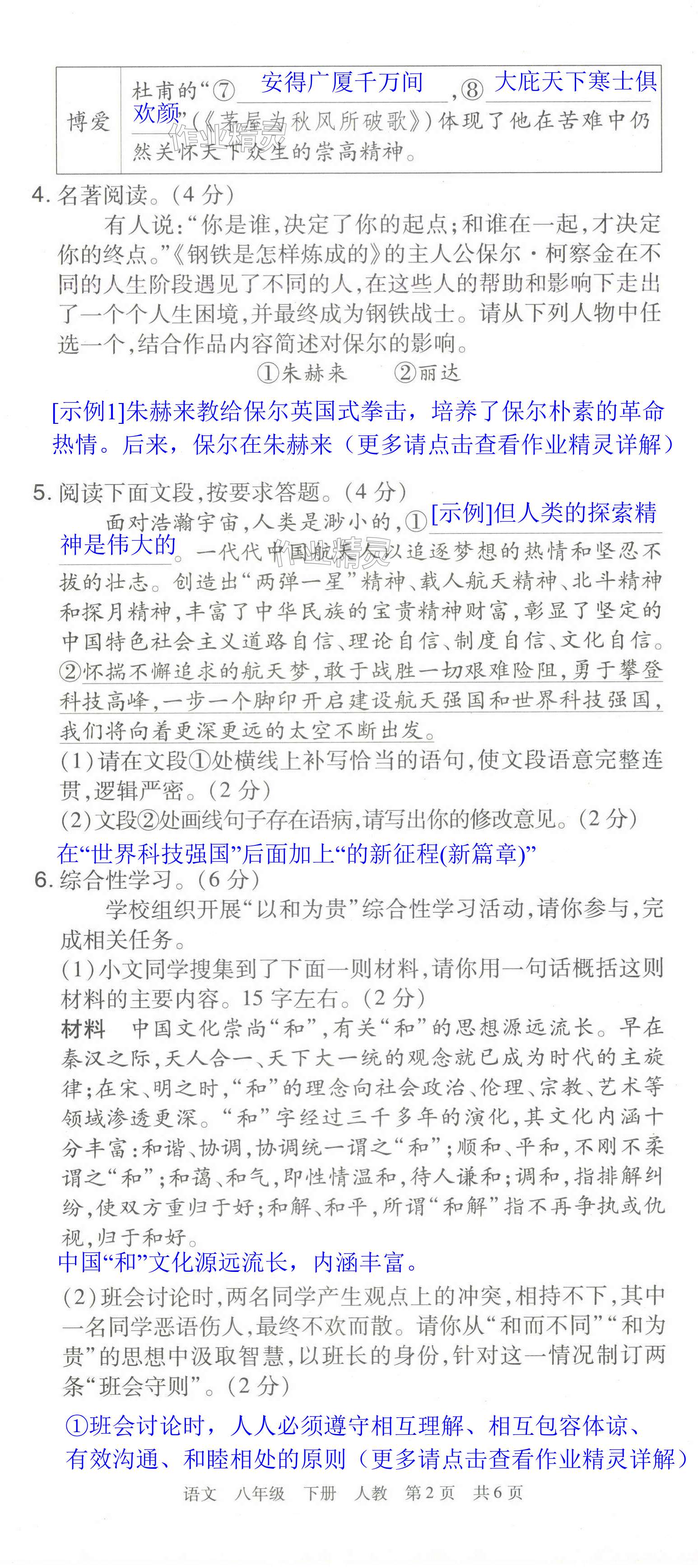 注:目前有些书本章节名称可能整理的还不是很完善,但都是按照顺序排列的,请同学们按照顺序仔细查找。练习册 2024年期末考试必刷卷八年级语文下册人教版洛阳专版 答案主要是用来给同学们做完题方便对答案用的,请勿直接抄袭。