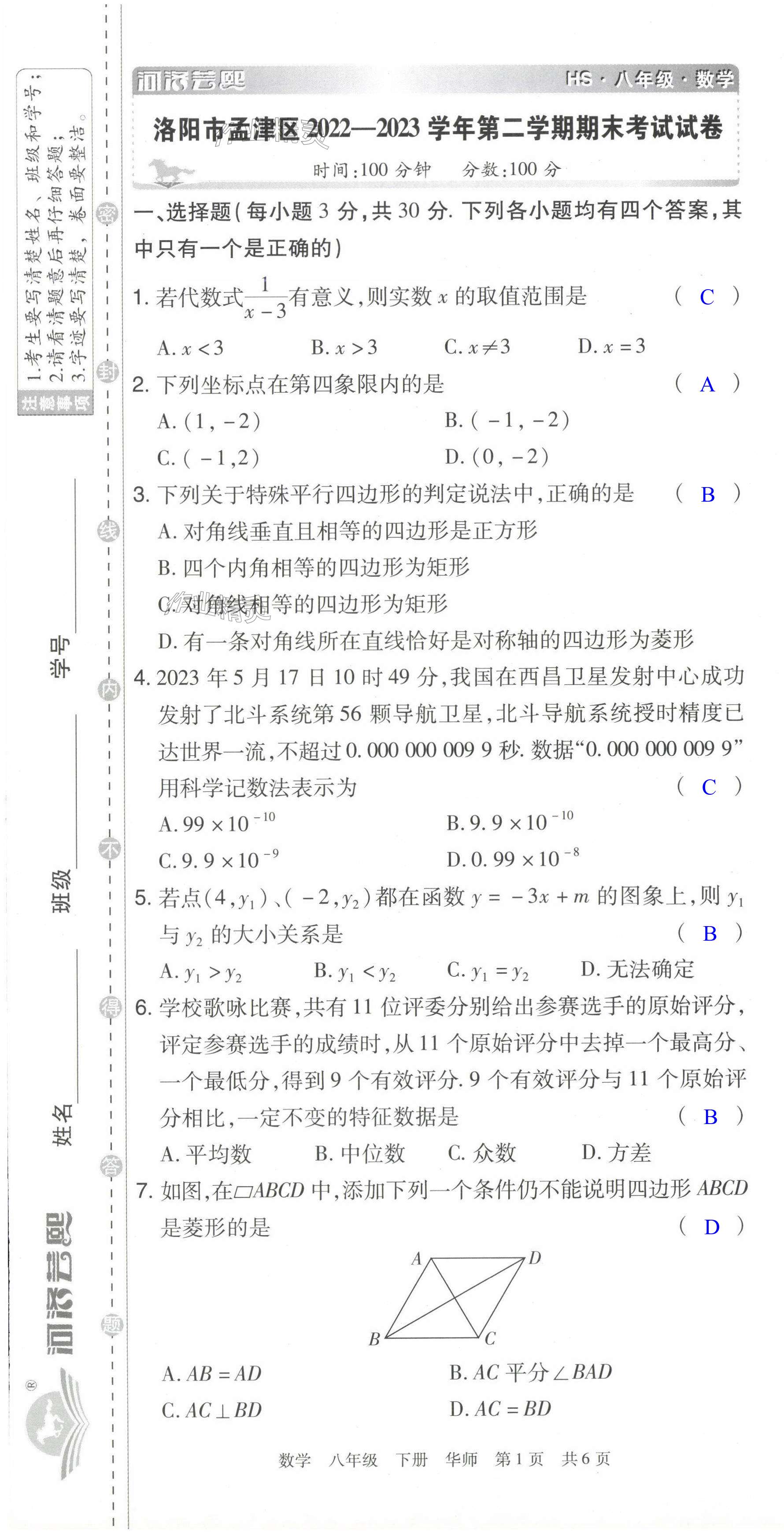注:目前有些书本章节名称可能整理的还不是很完善,但都是按照顺序排列的,请同学们按照顺序仔细查找。练习册 2024年期末考试必刷卷八年级数学下册华师大版洛阳专版 答案主要是用来给同学们做完题方便对答案用的,请勿直接抄袭。