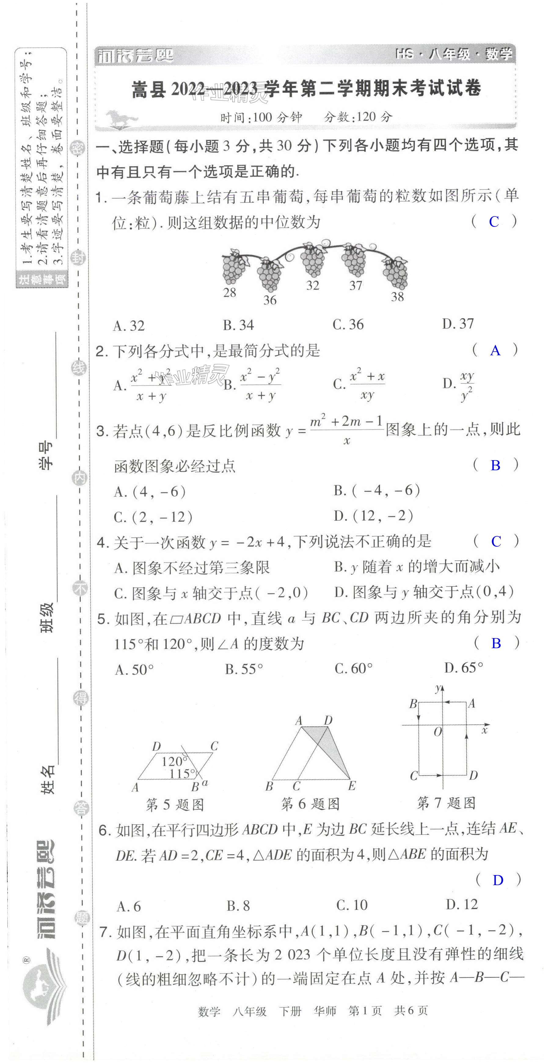 注:目前有些书本章节名称可能整理的还不是很完善,但都是按照顺序排列的,请同学们按照顺序仔细查找。练习册 2024年期末考试必刷卷八年级数学下册华师大版洛阳专版 答案主要是用来给同学们做完题方便对答案用的,请勿直接抄袭。