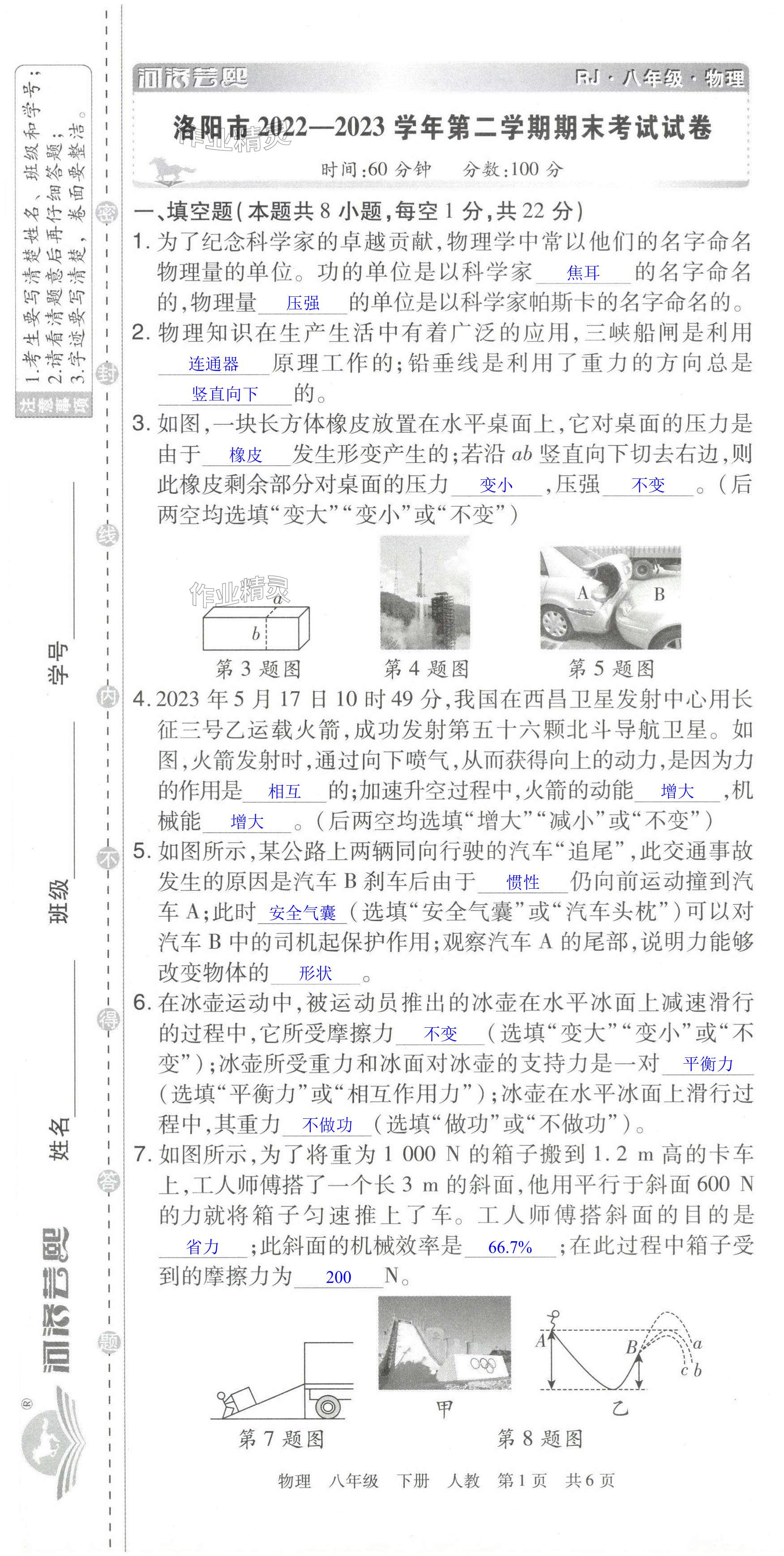 注:目前有些书本章节名称可能整理的还不是很完善,但都是按照顺序排列的,请同学们按照顺序仔细查找。练习册 2024年期末考试必刷卷八年级物理下册人教版洛阳专版 答案主要是用来给同学们做完题方便对答案用的,请勿直接抄袭。