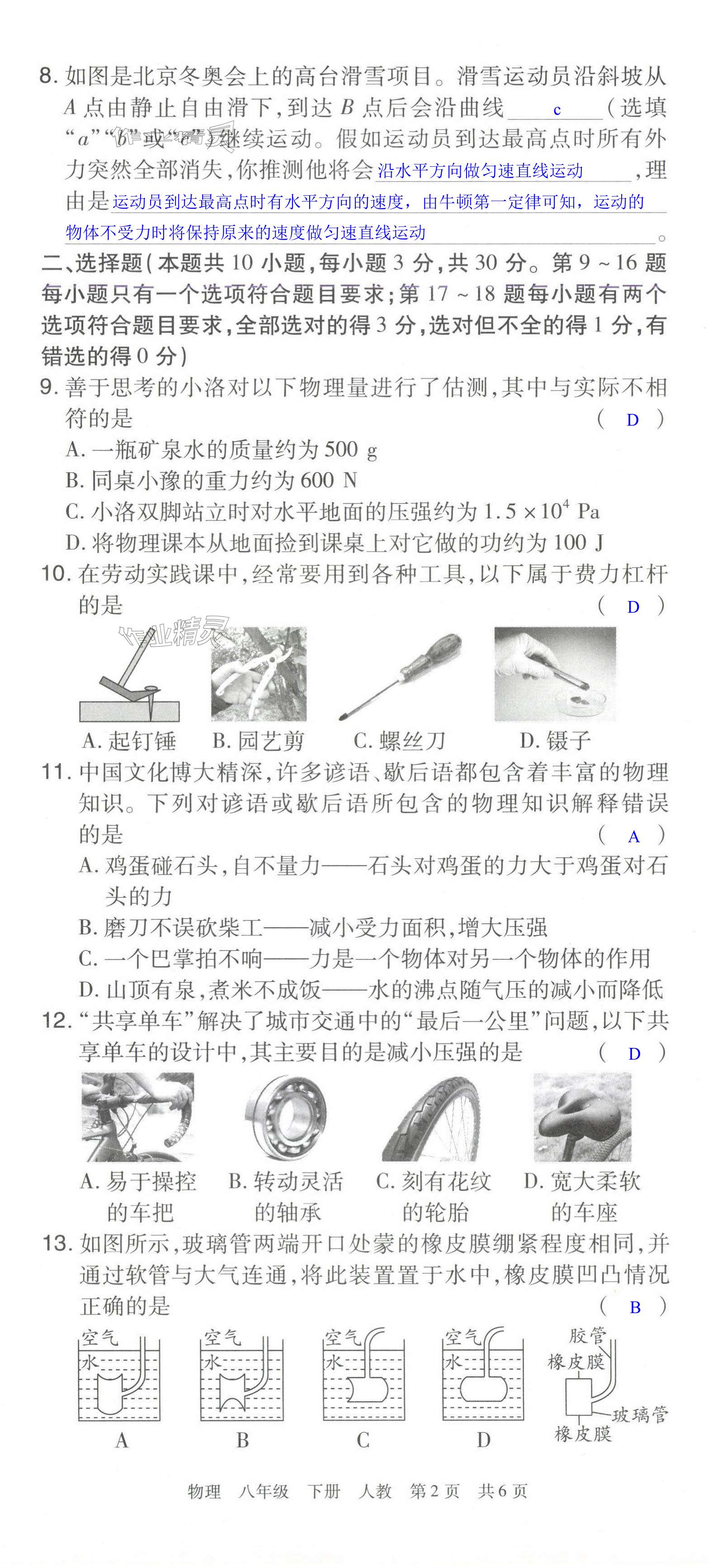 注:目前有些书本章节名称可能整理的还不是很完善,但都是按照顺序排列的,请同学们按照顺序仔细查找。练习册 2024年期末考试必刷卷八年级物理下册人教版洛阳专版 答案主要是用来给同学们做完题方便对答案用的,请勿直接抄袭。