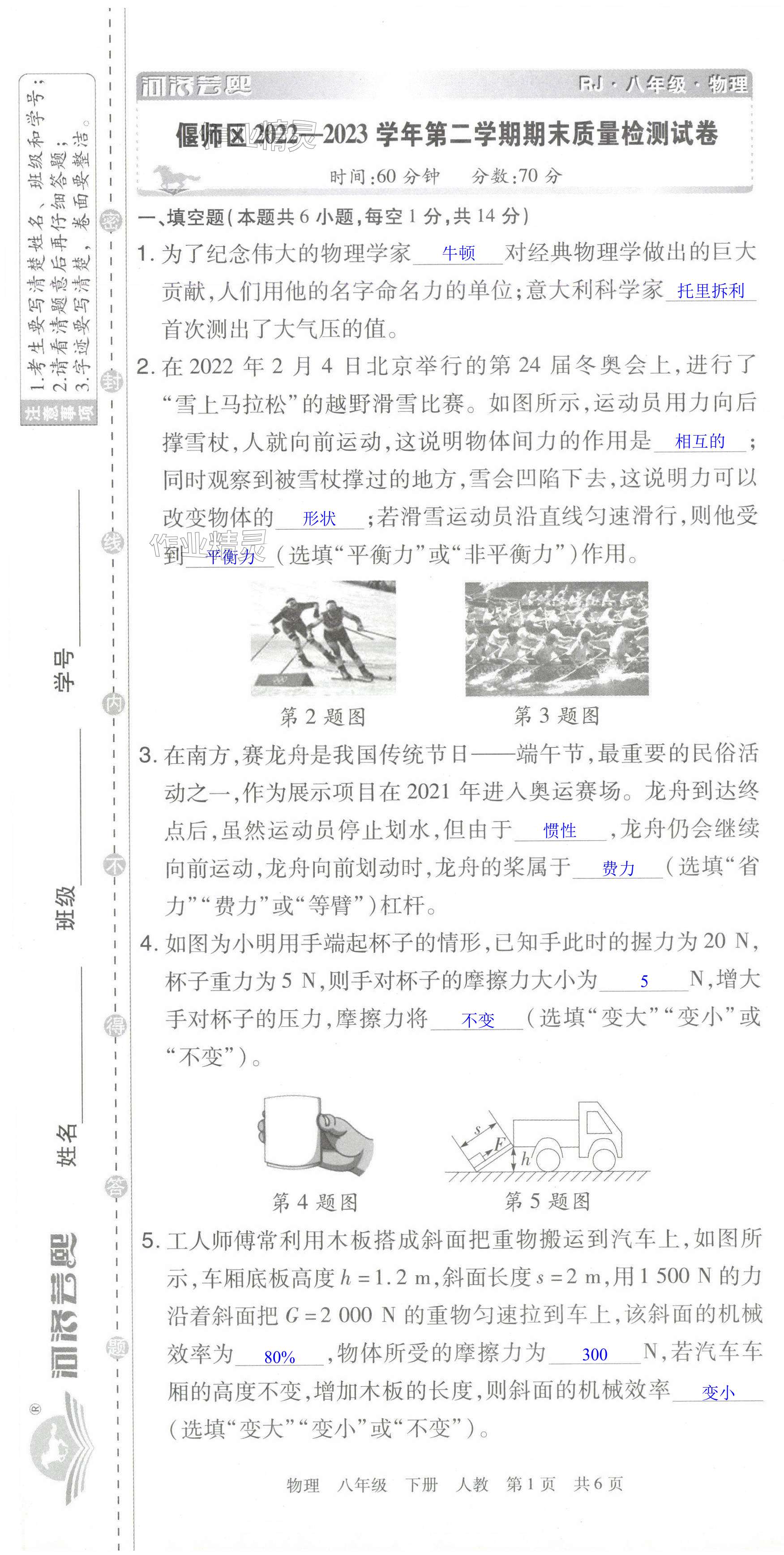 注:目前有些书本章节名称可能整理的还不是很完善,但都是按照顺序排列的,请同学们按照顺序仔细查找。练习册 2024年期末考试必刷卷八年级物理下册人教版洛阳专版 答案主要是用来给同学们做完题方便对答案用的,请勿直接抄袭。