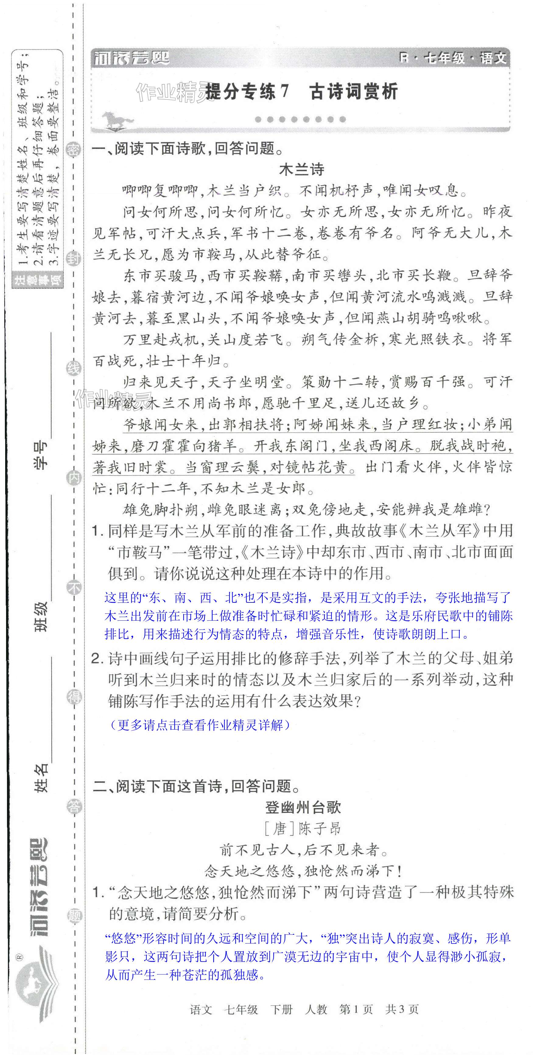 注:目前有些书本章节名称可能整理的还不是很完善,但都是按照顺序排列的,请同学们按照顺序仔细查找。练习册 2024年期末考试必刷卷七年级语文下册人教版洛阳专版 答案主要是用来给同学们做完题方便对答案用的,请勿直接抄袭。