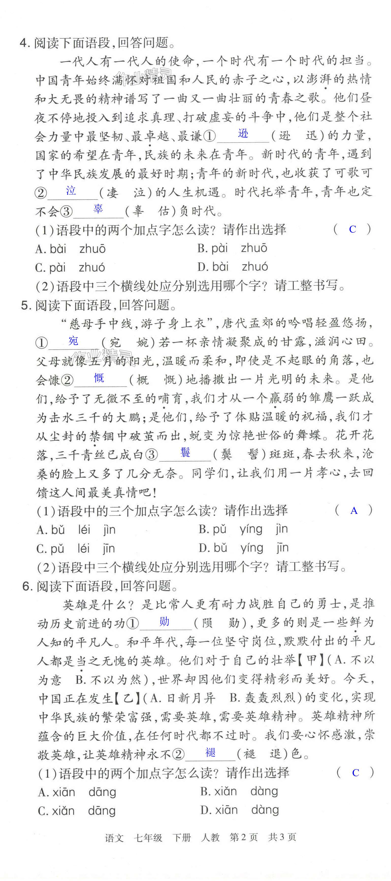 注:目前有些书本章节名称可能整理的还不是很完善,但都是按照顺序排列的,请同学们按照顺序仔细查找。练习册 2024年期末考试必刷卷七年级语文下册人教版洛阳专版 答案主要是用来给同学们做完题方便对答案用的,请勿直接抄袭。