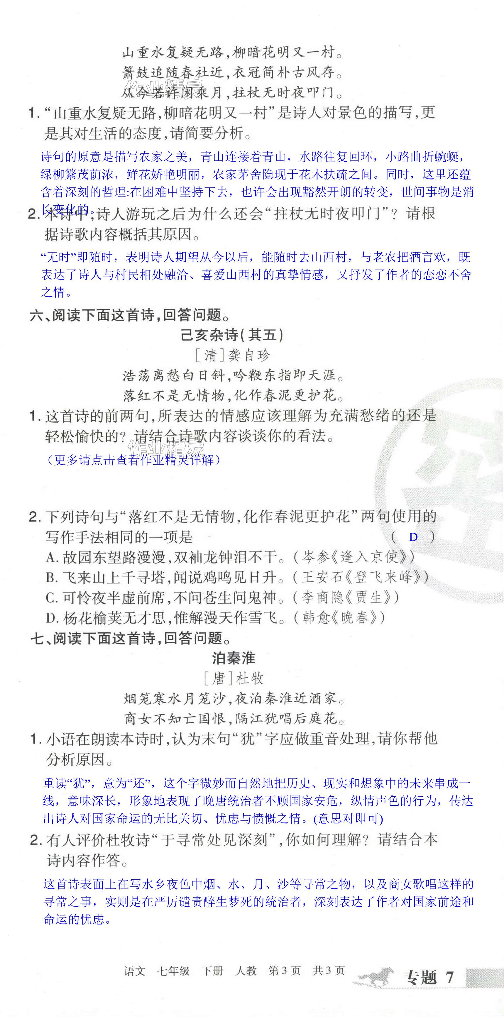 注:目前有些书本章节名称可能整理的还不是很完善,但都是按照顺序排列的,请同学们按照顺序仔细查找。练习册 2024年期末考试必刷卷七年级语文下册人教版洛阳专版 答案主要是用来给同学们做完题方便对答案用的,请勿直接抄袭。