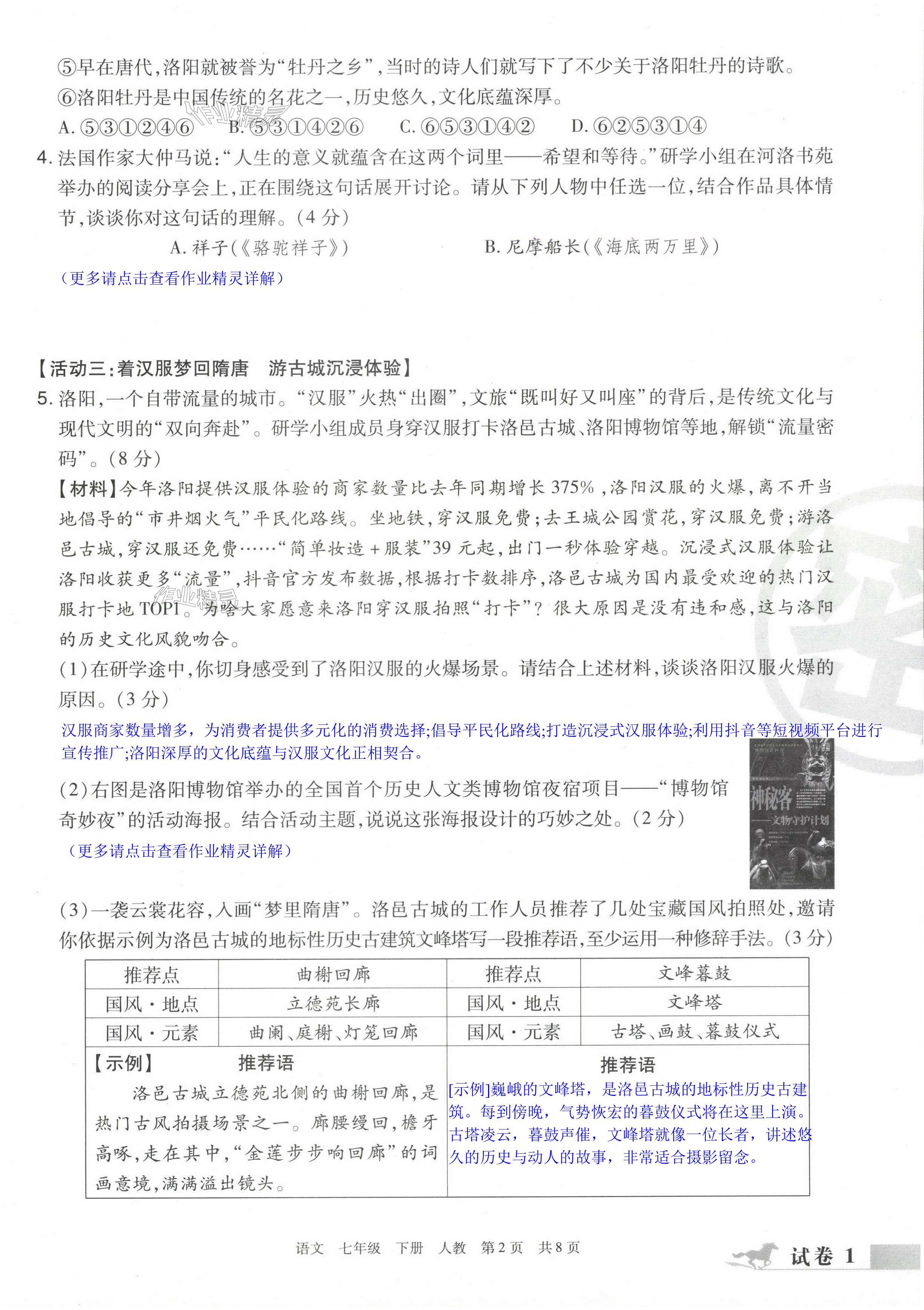 注:目前有些书本章节名称可能整理的还不是很完善,但都是按照顺序排列的,请同学们按照顺序仔细查找。练习册 2024年期末考试必刷卷七年级语文下册人教版洛阳专版 答案主要是用来给同学们做完题方便对答案用的,请勿直接抄袭。