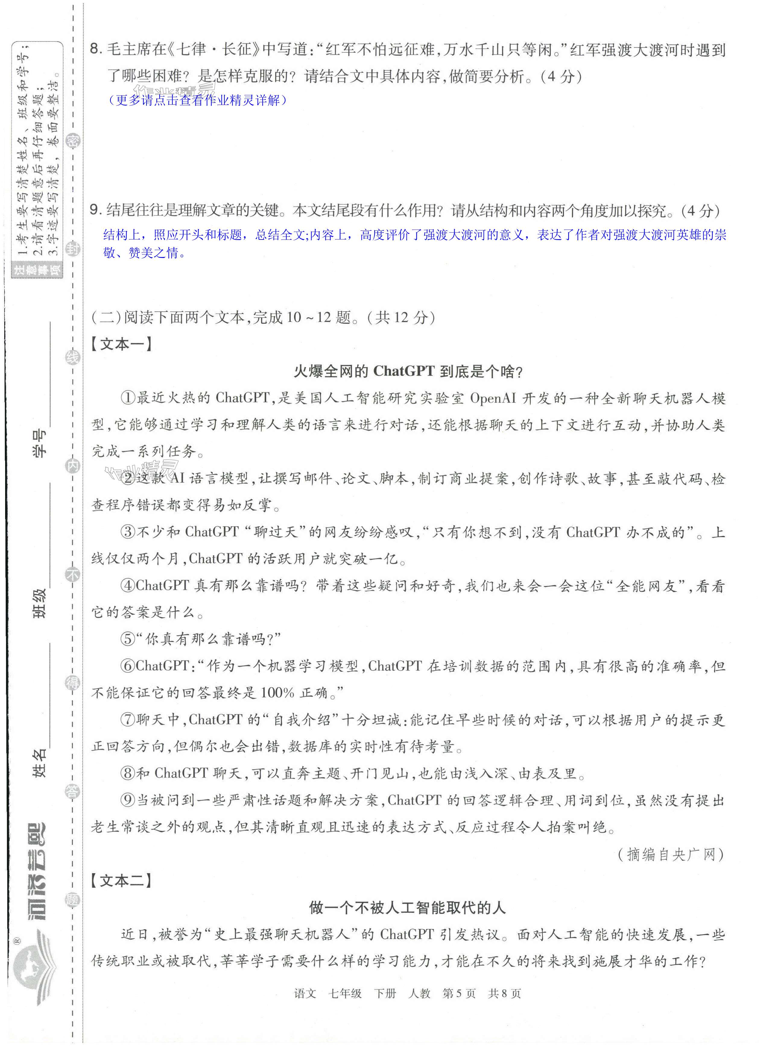注:目前有些书本章节名称可能整理的还不是很完善,但都是按照顺序排列的,请同学们按照顺序仔细查找。练习册 2024年期末考试必刷卷七年级语文下册人教版洛阳专版 答案主要是用来给同学们做完题方便对答案用的,请勿直接抄袭。