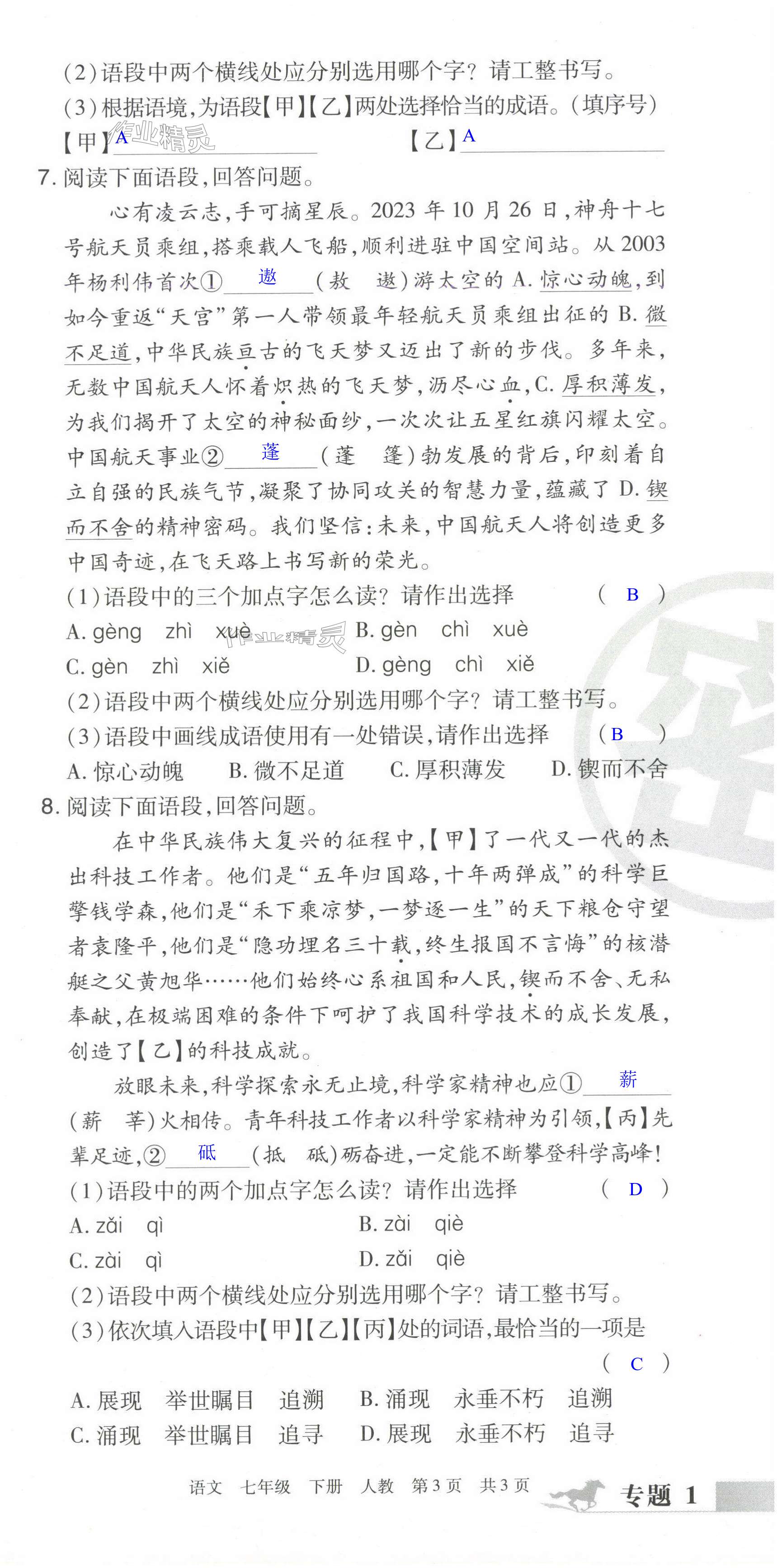 注:目前有些书本章节名称可能整理的还不是很完善,但都是按照顺序排列的,请同学们按照顺序仔细查找。练习册 2024年期末考试必刷卷七年级语文下册人教版洛阳专版 答案主要是用来给同学们做完题方便对答案用的,请勿直接抄袭。
