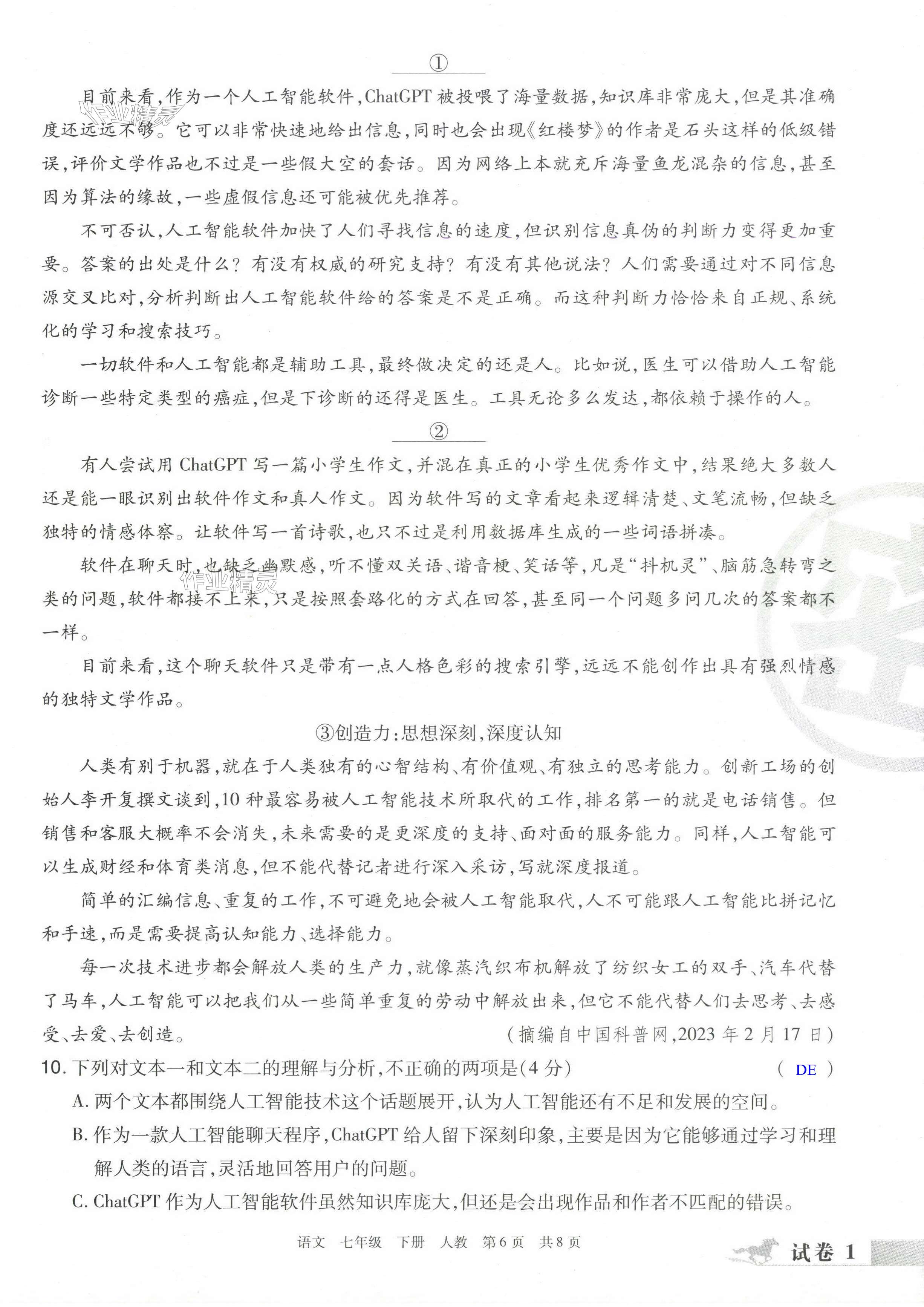 注:目前有些书本章节名称可能整理的还不是很完善,但都是按照顺序排列的,请同学们按照顺序仔细查找。练习册 2024年期末考试必刷卷七年级语文下册人教版洛阳专版 答案主要是用来给同学们做完题方便对答案用的,请勿直接抄袭。