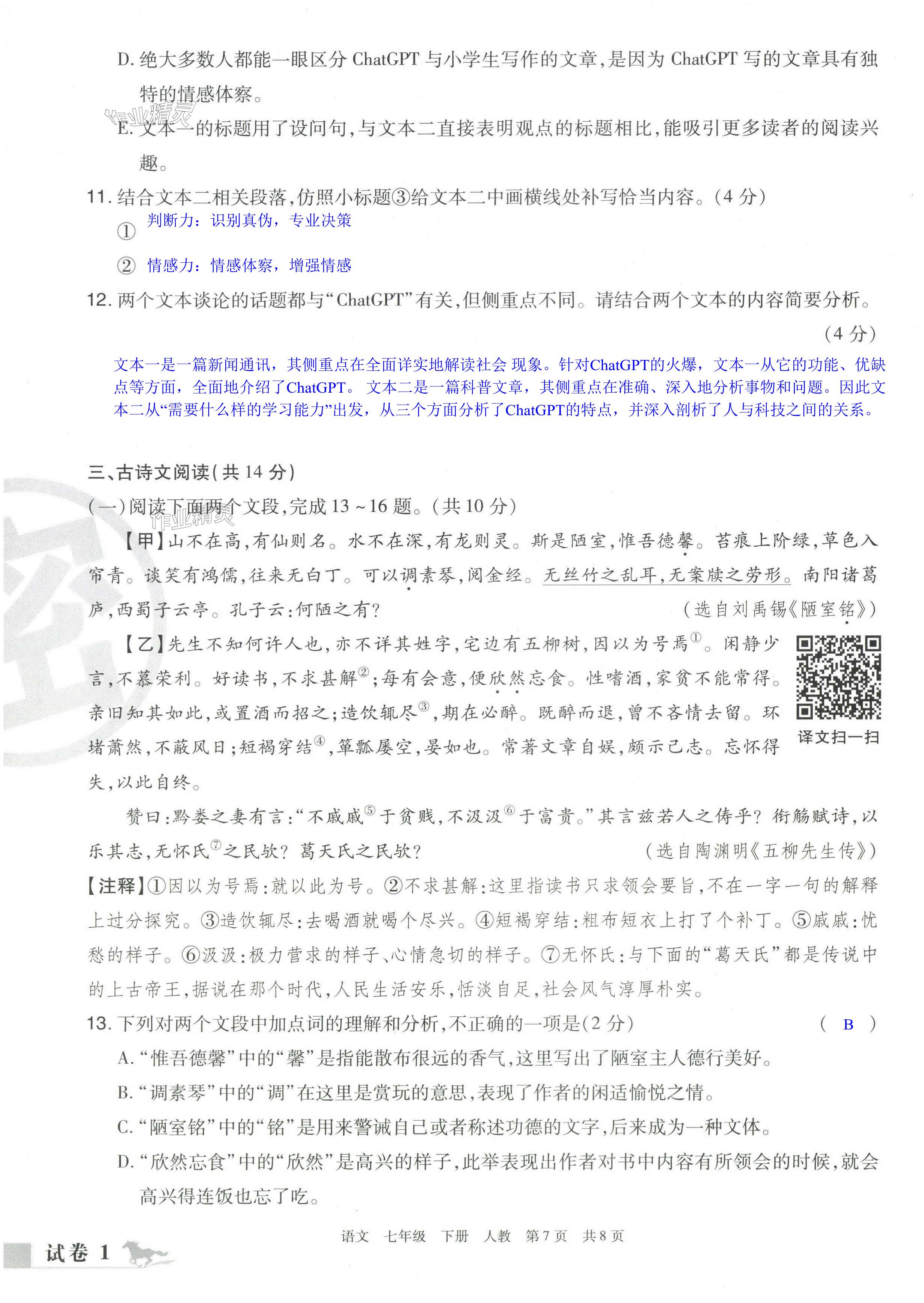 注:目前有些书本章节名称可能整理的还不是很完善,但都是按照顺序排列的,请同学们按照顺序仔细查找。练习册 2024年期末考试必刷卷七年级语文下册人教版洛阳专版 答案主要是用来给同学们做完题方便对答案用的,请勿直接抄袭。