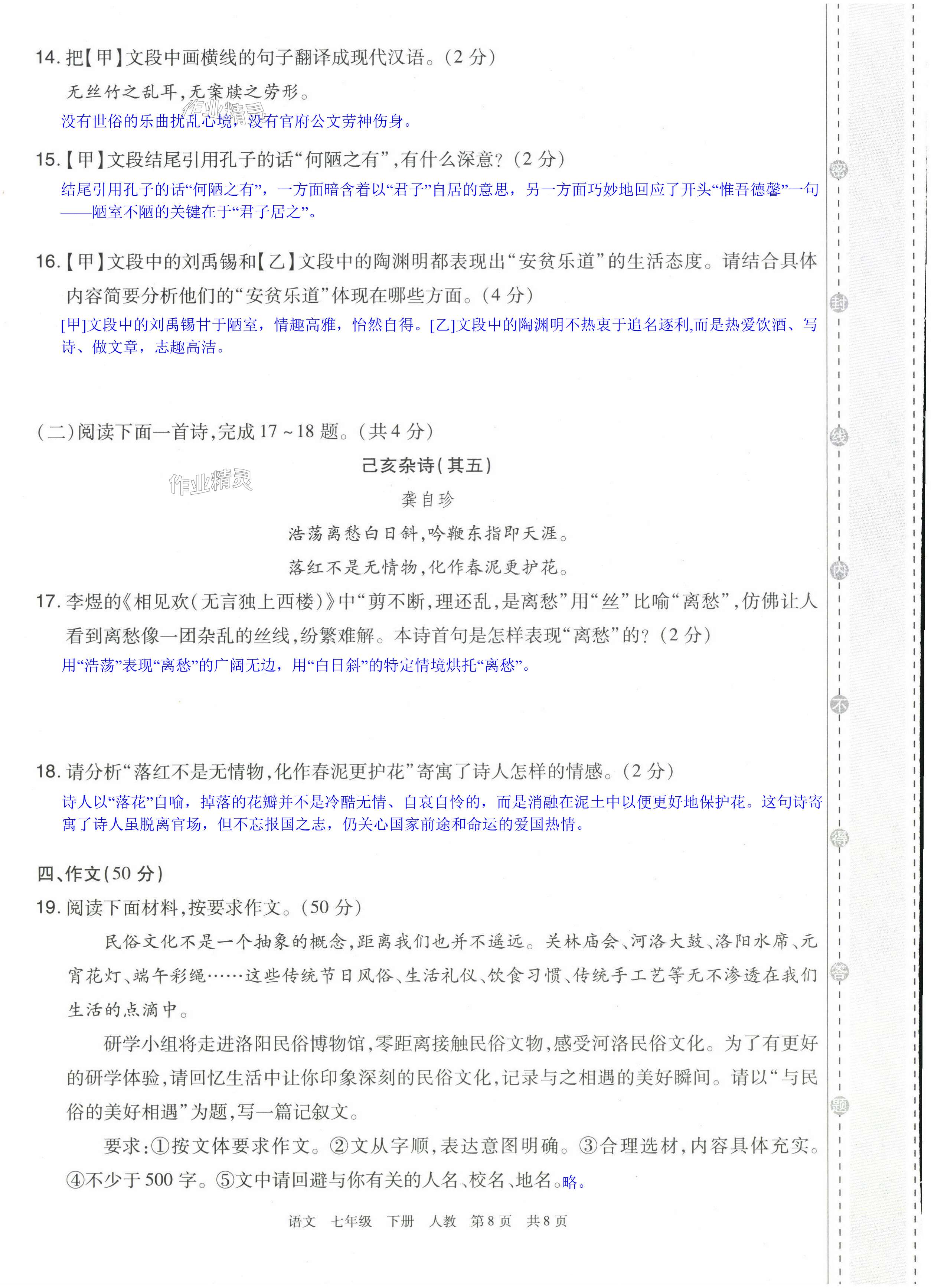 注:目前有些书本章节名称可能整理的还不是很完善,但都是按照顺序排列的,请同学们按照顺序仔细查找。练习册 2024年期末考试必刷卷七年级语文下册人教版洛阳专版 答案主要是用来给同学们做完题方便对答案用的,请勿直接抄袭。