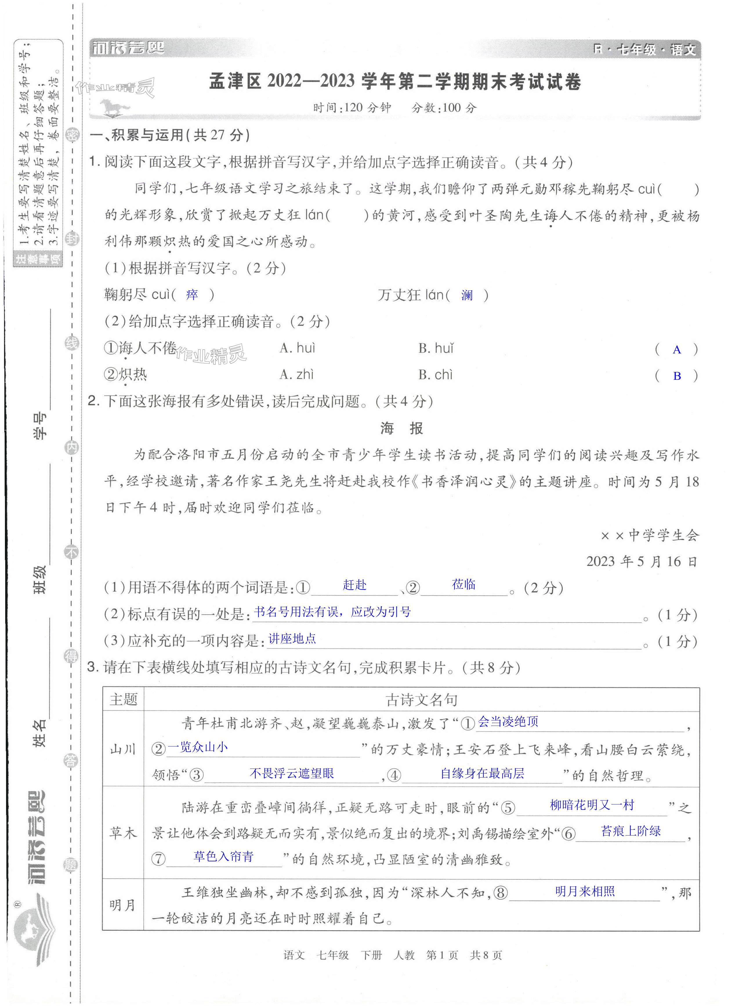 注:目前有些书本章节名称可能整理的还不是很完善,但都是按照顺序排列的,请同学们按照顺序仔细查找。练习册 2024年期末考试必刷卷七年级语文下册人教版洛阳专版 答案主要是用来给同学们做完题方便对答案用的,请勿直接抄袭。