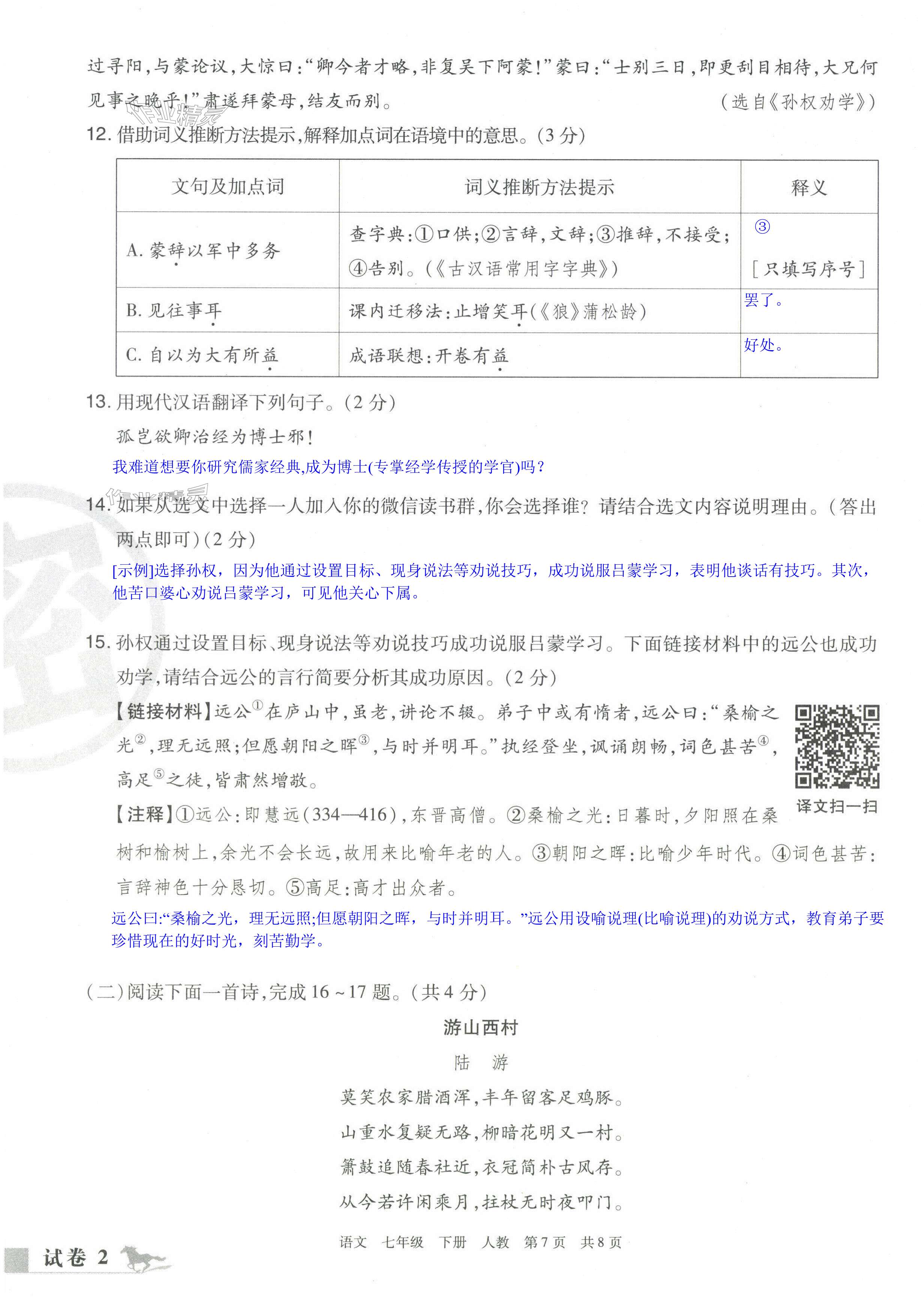 注:目前有些书本章节名称可能整理的还不是很完善,但都是按照顺序排列的,请同学们按照顺序仔细查找。练习册 2024年期末考试必刷卷七年级语文下册人教版洛阳专版 答案主要是用来给同学们做完题方便对答案用的,请勿直接抄袭。