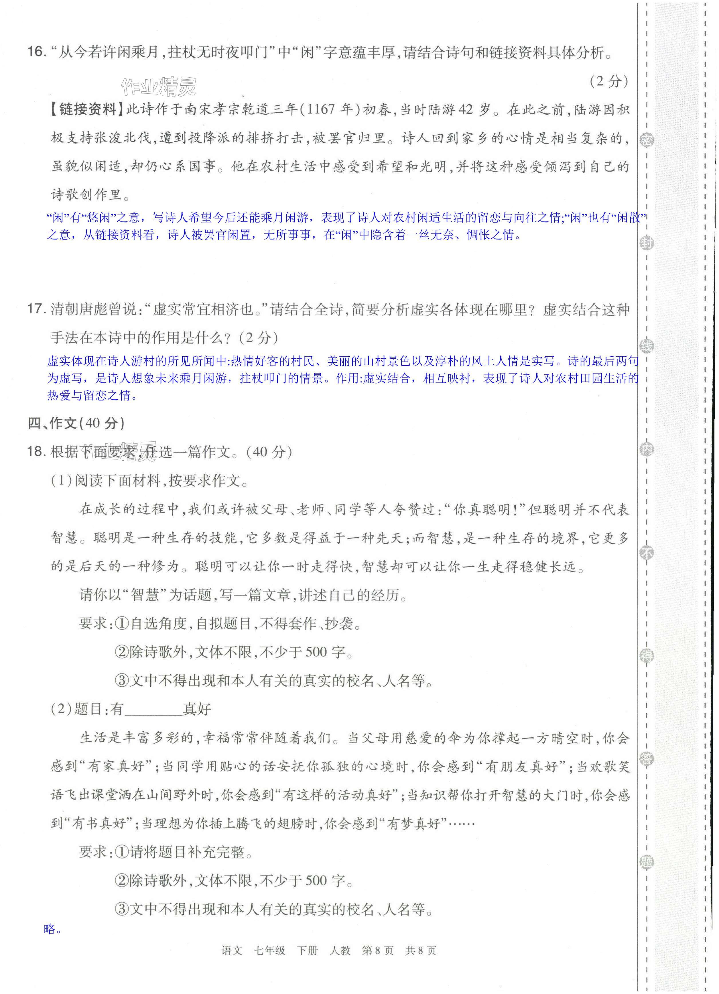注:目前有些书本章节名称可能整理的还不是很完善,但都是按照顺序排列的,请同学们按照顺序仔细查找。练习册 2024年期末考试必刷卷七年级语文下册人教版洛阳专版 答案主要是用来给同学们做完题方便对答案用的,请勿直接抄袭。