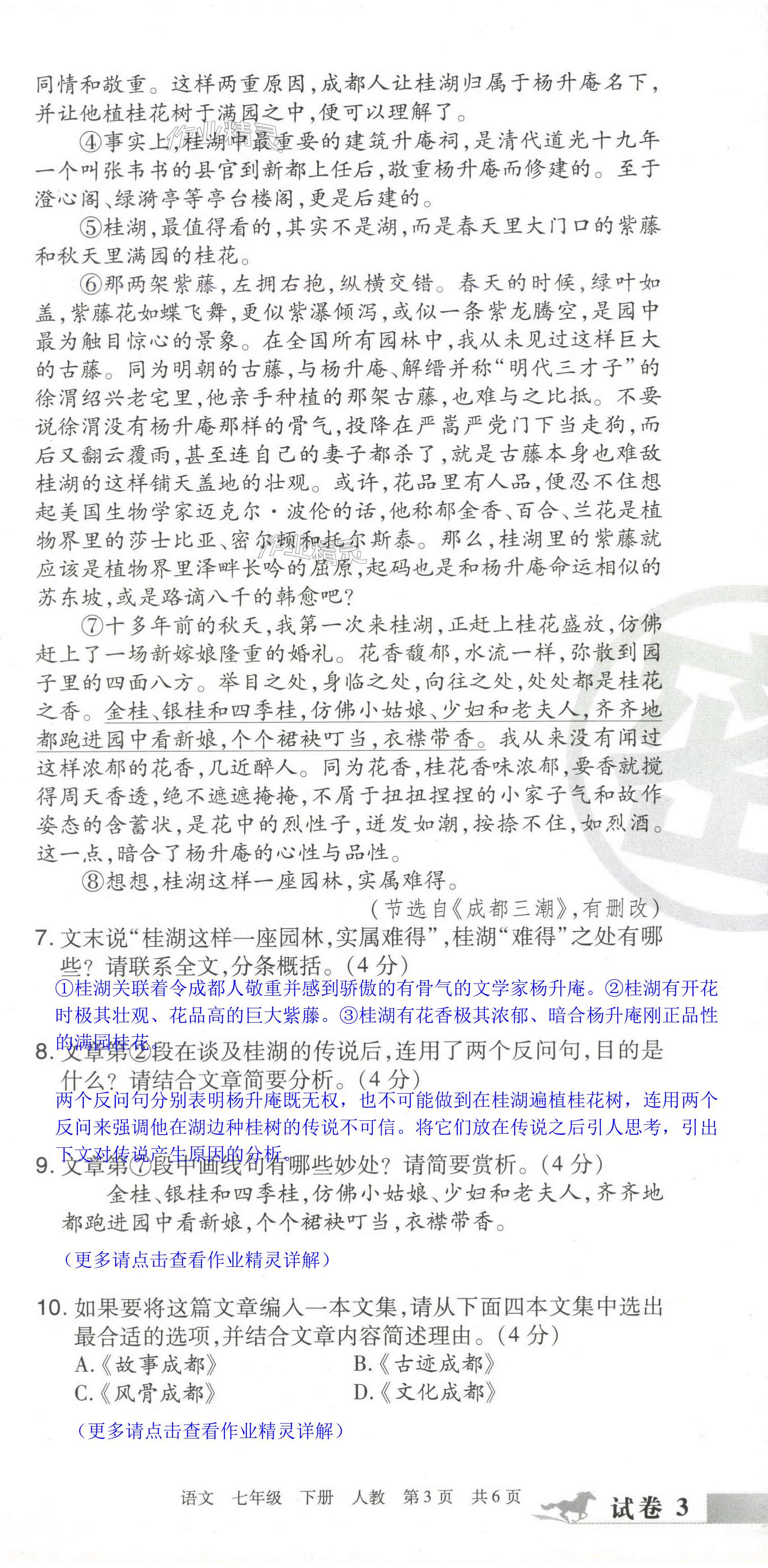注:目前有些书本章节名称可能整理的还不是很完善,但都是按照顺序排列的,请同学们按照顺序仔细查找。练习册 2024年期末考试必刷卷七年级语文下册人教版洛阳专版 答案主要是用来给同学们做完题方便对答案用的,请勿直接抄袭。