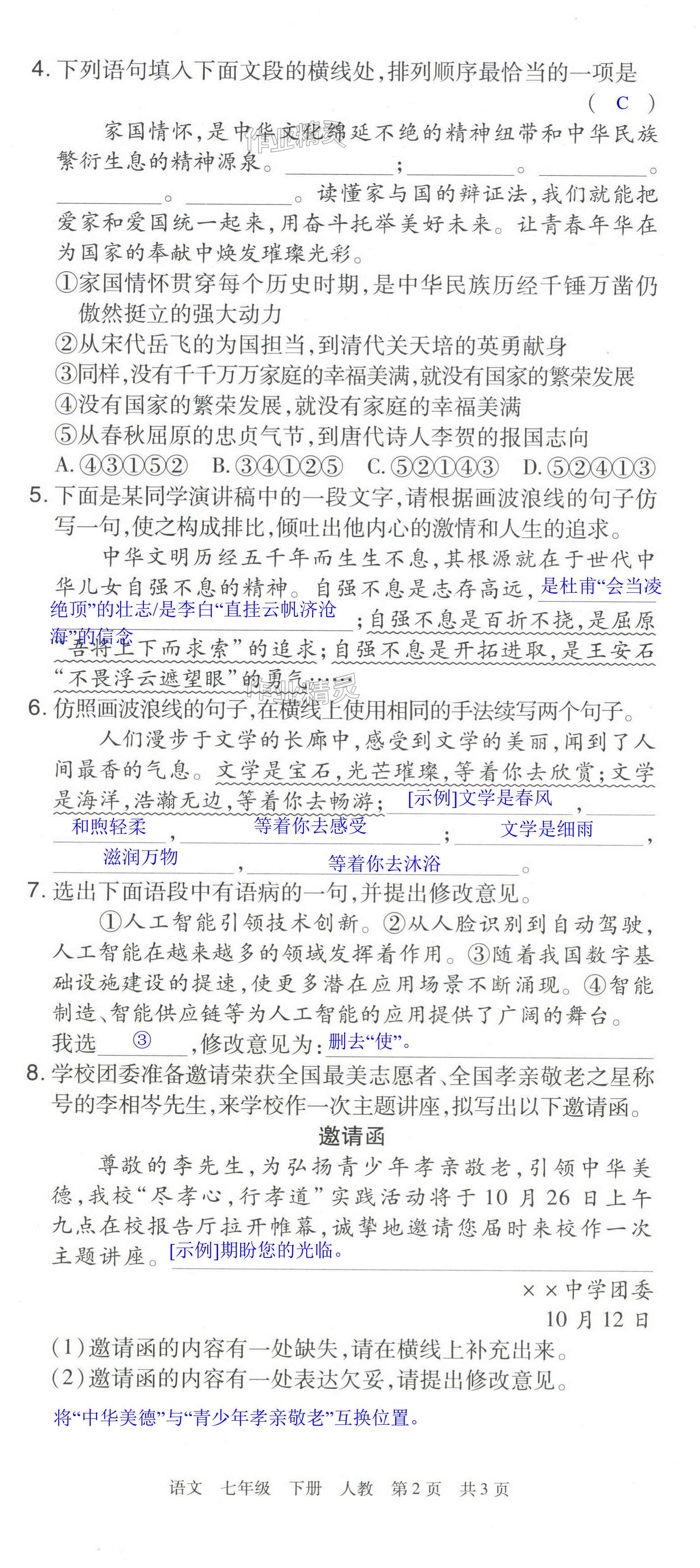注:目前有些书本章节名称可能整理的还不是很完善,但都是按照顺序排列的,请同学们按照顺序仔细查找。练习册 2024年期末考试必刷卷七年级语文下册人教版洛阳专版 答案主要是用来给同学们做完题方便对答案用的,请勿直接抄袭。