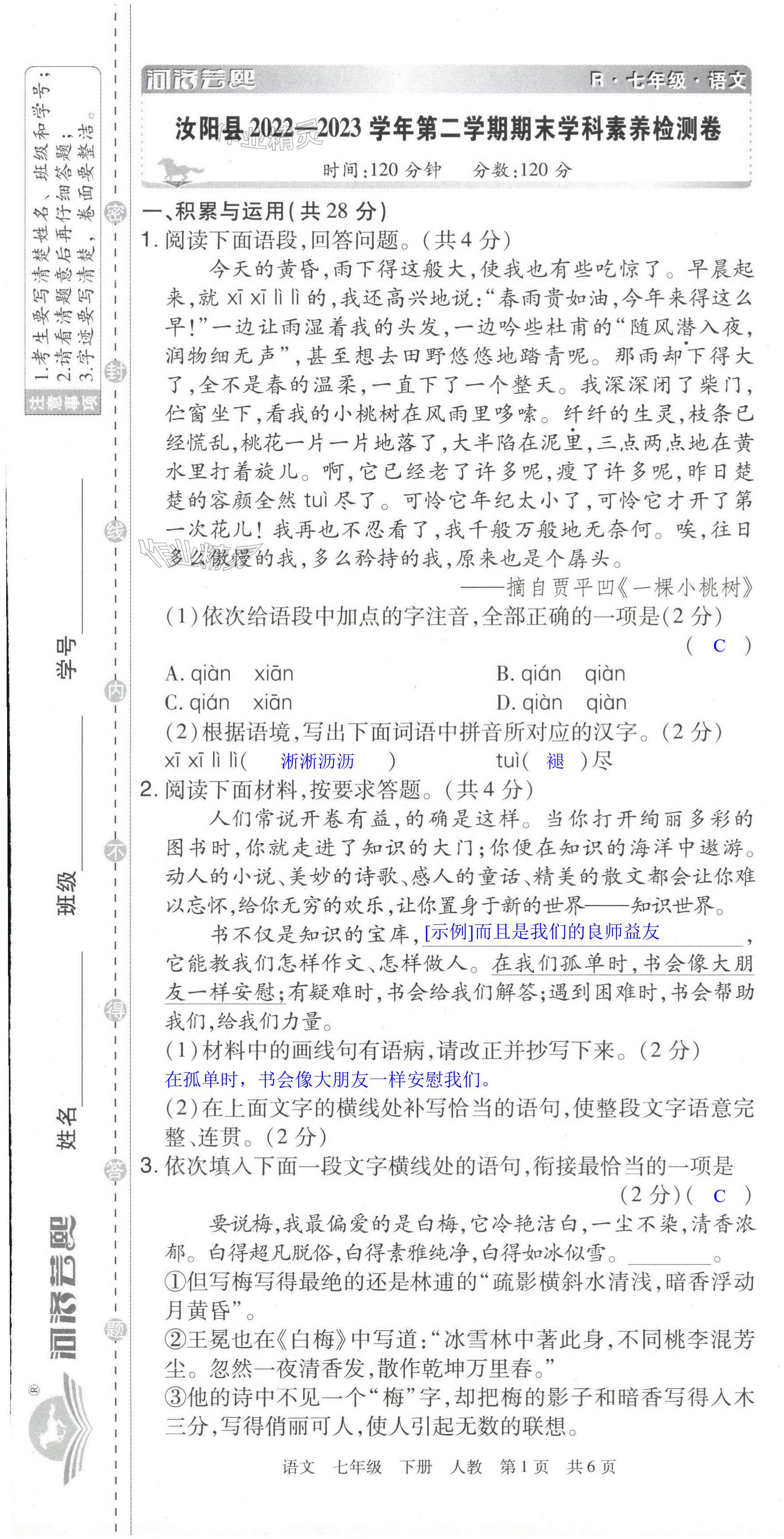 注:目前有些书本章节名称可能整理的还不是很完善,但都是按照顺序排列的,请同学们按照顺序仔细查找。练习册 2024年期末考试必刷卷七年级语文下册人教版洛阳专版 答案主要是用来给同学们做完题方便对答案用的,请勿直接抄袭。
