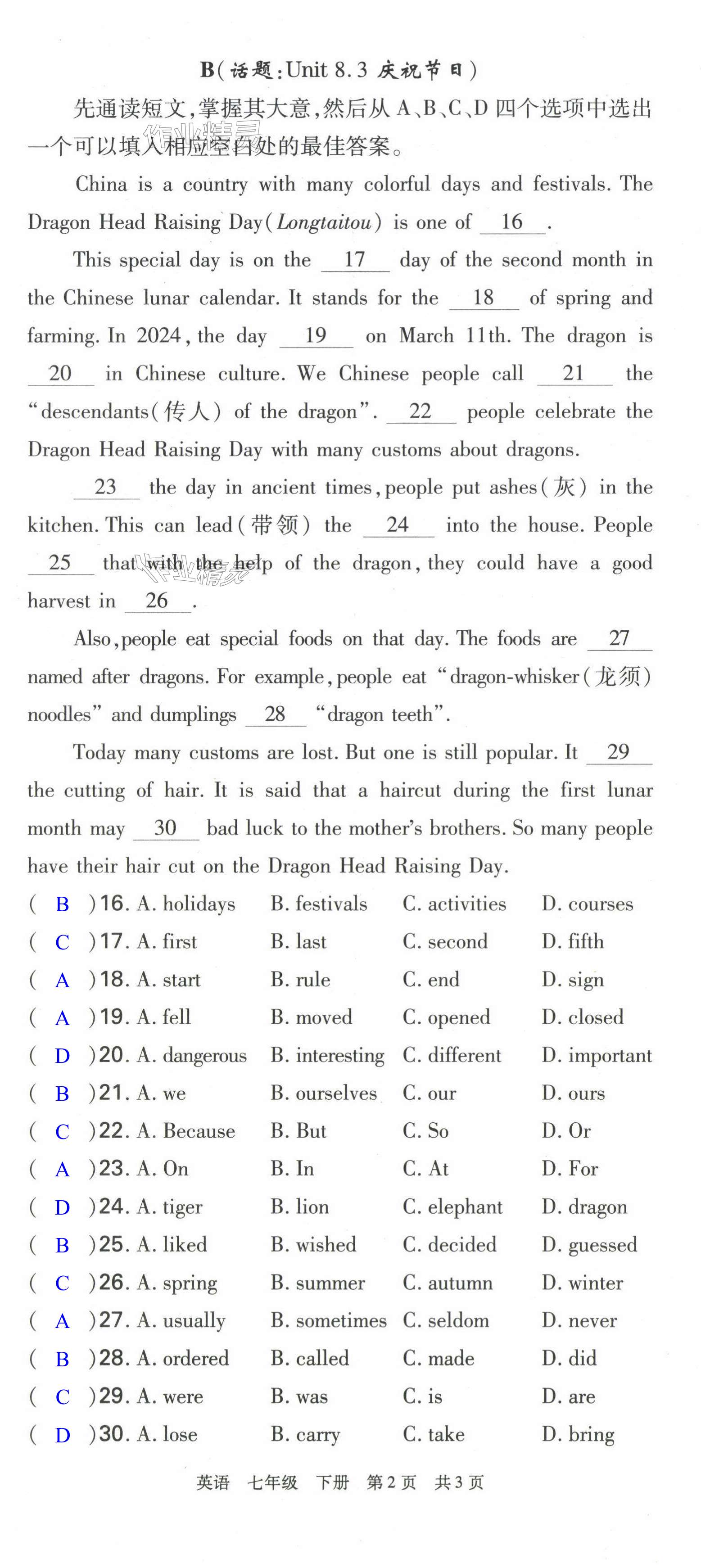 注:目前有些书本章节名称可能整理的还不是很完善,但都是按照顺序排列的,请同学们按照顺序仔细查找。练习册 2024年期末考试必刷卷七年级英语下册仁爱版河南专版 答案主要是用来给同学们做完题方便对答案用的,请勿直接抄袭。
