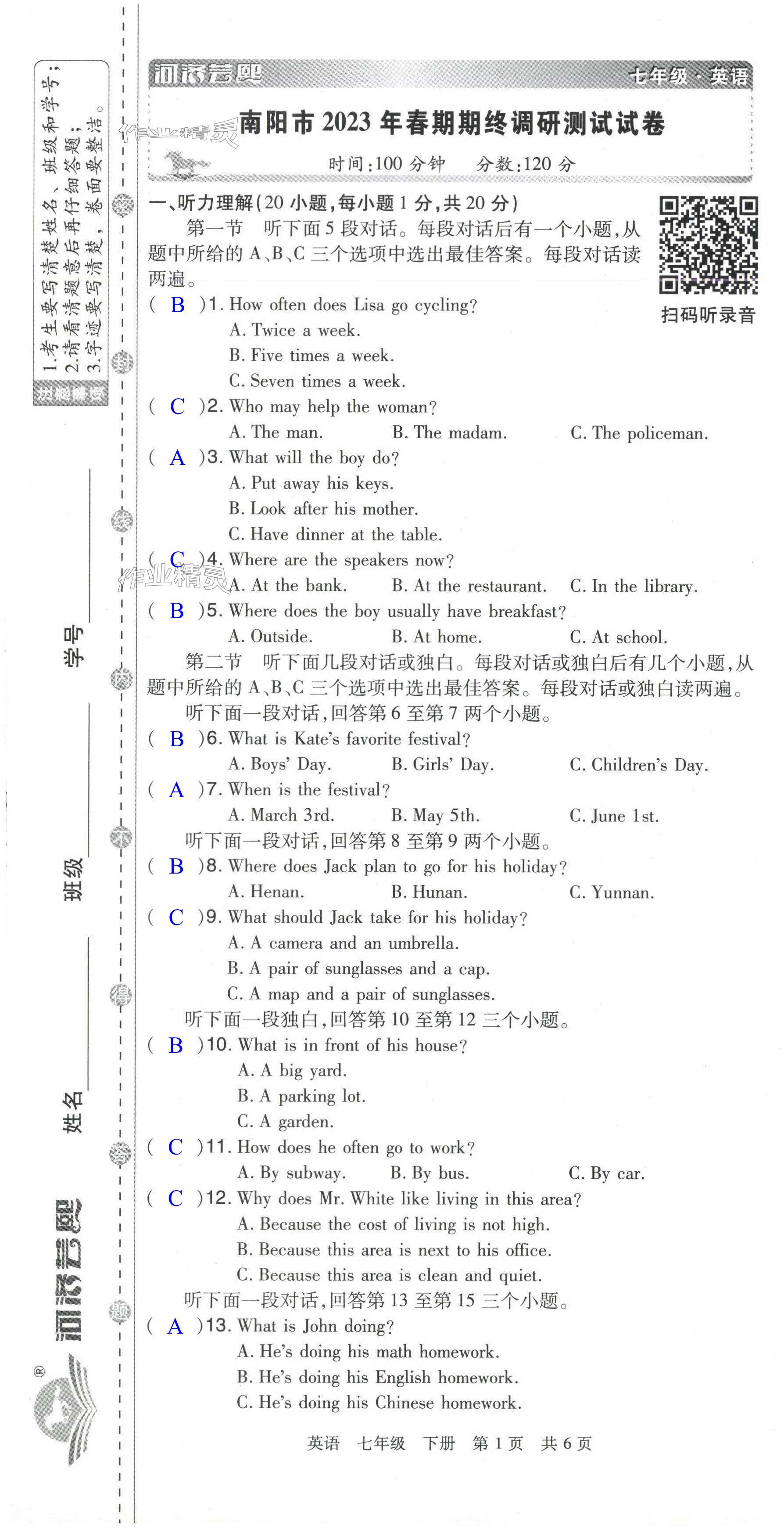 注:目前有些书本章节名称可能整理的还不是很完善,但都是按照顺序排列的,请同学们按照顺序仔细查找。练习册 2024年期末考试必刷卷七年级英语下册仁爱版河南专版 答案主要是用来给同学们做完题方便对答案用的,请勿直接抄袭。