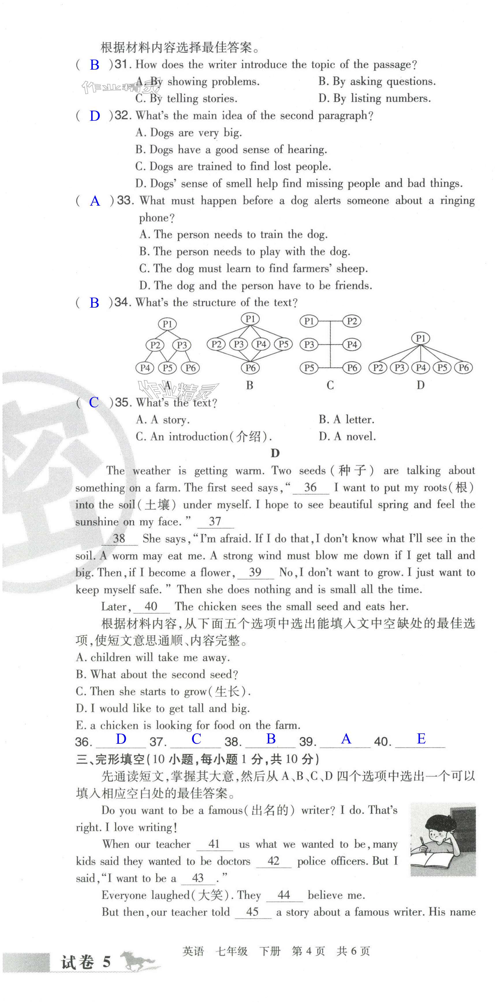 注:目前有些书本章节名称可能整理的还不是很完善,但都是按照顺序排列的,请同学们按照顺序仔细查找。练习册 2024年期末考试必刷卷七年级英语下册仁爱版河南专版 答案主要是用来给同学们做完题方便对答案用的,请勿直接抄袭。